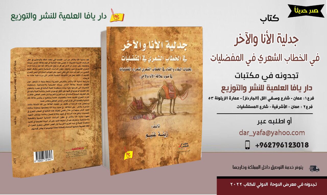 : صدرَ حديثًا عن دارِ يافا العلميّةِ للنّشرِ والتّوزيعِ الكتابُ الموسومُ بـِ “”جدليّة الأنا والآخر في الخِطابِ الشّعريِّ في المفضليّاتِ””، للباحثةِ ” زينة محي الدين غنيم” ، وبدعمٍ من وزارةِ الثقافةِ الأردنيّةِ. وهو مُؤلَّفٌ يُعنى بالأدبِ الجاهليِّ وتحديدًا ديوان “المفضّليّات” وفيه عرضتِ الباحثةُ لنظرةِ الشاعرِ الجاهليِّ بشكل عام والمخضرمِ بشكلٍ خاص – على اعتبارِ أنّه ديوانٌ يضمُ أشعارَ الجاهليينَ وبعضَ الإسلاميينَ – إلى مسألةِ الوجودِ، وموقفِهِ من الحياةِ والموتِ وانقضاءِ مظاهرِ الشّبابِ من خلال علاقة (أناه) مع كل ما يتصل ببيئتِهِ الصّحراوية/ الجزيرة العربيّة (الآخر) كالمكان، والحيوان، والسُّلطة. ونهجت الباحثةُ في هذه الدّراسة المنهجَ النّفسيَّ وفقًا لما تقتضيهِ جدليّةُ الأنا والآخرِ، عبرَ سبرِ أغوارِ النِّتاجِ الشِّعريِّ لشعراءِ المفضّليّاتِ، وتناولِهِ بالدّراسةِ والتّحليلِ.