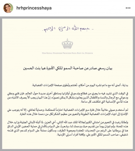 اعلنت الاميرة هيا الحسين انتهاء جلسات المحكمة الخاصة بالتفريق بينها وبين حاكم دبي وقدمت الشكر لشقيقها الملك عبدالله الثاني وشقيقها الامير علي بن الحسين لما قدماه من دعم لها خلال السنوات الماضية وتاليا نص البيان