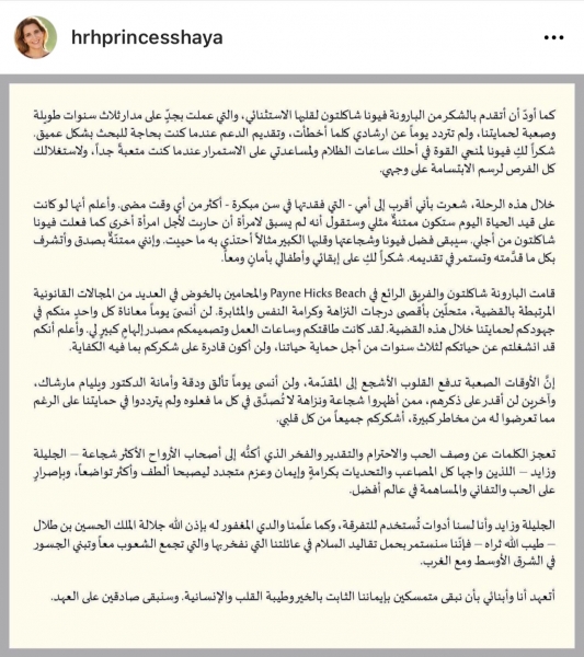 ولطالما رغبت في التعبير عن امتناني الكبير لجلالة الملك عبد الله الثاني، أخي العزيز، لما أثبتّه لأبنائي الجليلة وزايد خلال هذه المحنة، ولم تتوانَ يوماً عن تقديم حبك ودعمك لنا، وشعرتُ على الدوام بالأمان في حماية الحضن الأردني الدافئ هنا في بريطانيا على الرغم من التحديات المعقدة وصعوبة الظرف، وسأكون ممتنةٌ على الدوام للدعم الذي قدّمه شقيقي، صاحب السمو الملكي الأمير علي، وكافة أفراد أسرتي الأردنية.
