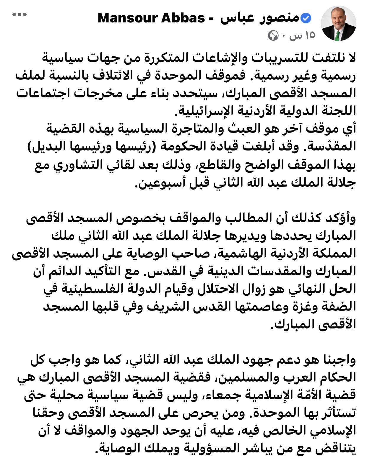 قال الدكتور منصور عباس رئيس القائمة العربية الموحدة بالكنيست الاسرائيلي في ادراج له عبر الفيسبوك ان المطالب بخصوص المسجد الأقصى يحددها الملك عبد الله الثاني صاحب الوصاية عليه وعلى المقدسات الدينية في القدس