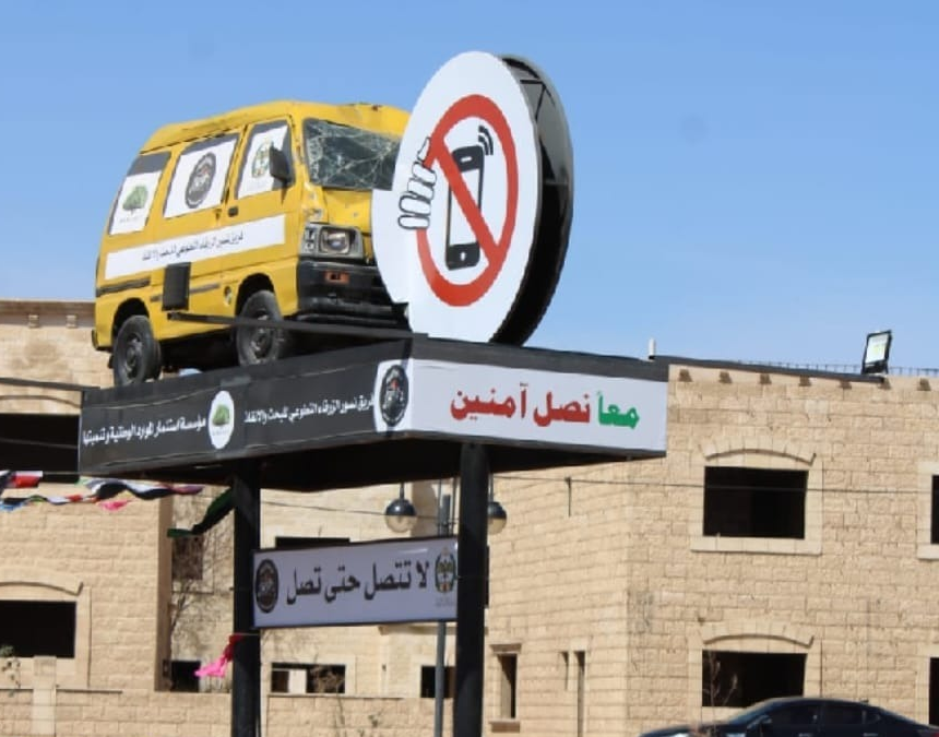 دشنت مديرية الإعلام والشرطة المجتمعية بالزرقاء، اليوم الاثنين، مجسم مركبة صغيرة مصطدمة بعلامة هاتف نقال كرسالة تحذيرية من حوادث السير وخطورة الانشغال ببرامج التواصل الاجتماعي المتعددة.