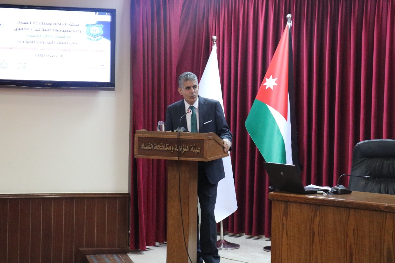 حيث أكد رئيس مجلس النزاهة ومكافحة الفساد الدكتور مهند حجازي للطلبة أن جرائم الفساد تعد من أكثر الجرائم خطورة على أمن الدول والمجتمعات لما تخلقه من آثار سلبية وعواقب وخيمة على المستويين الاجتماعي والاقتصادي .