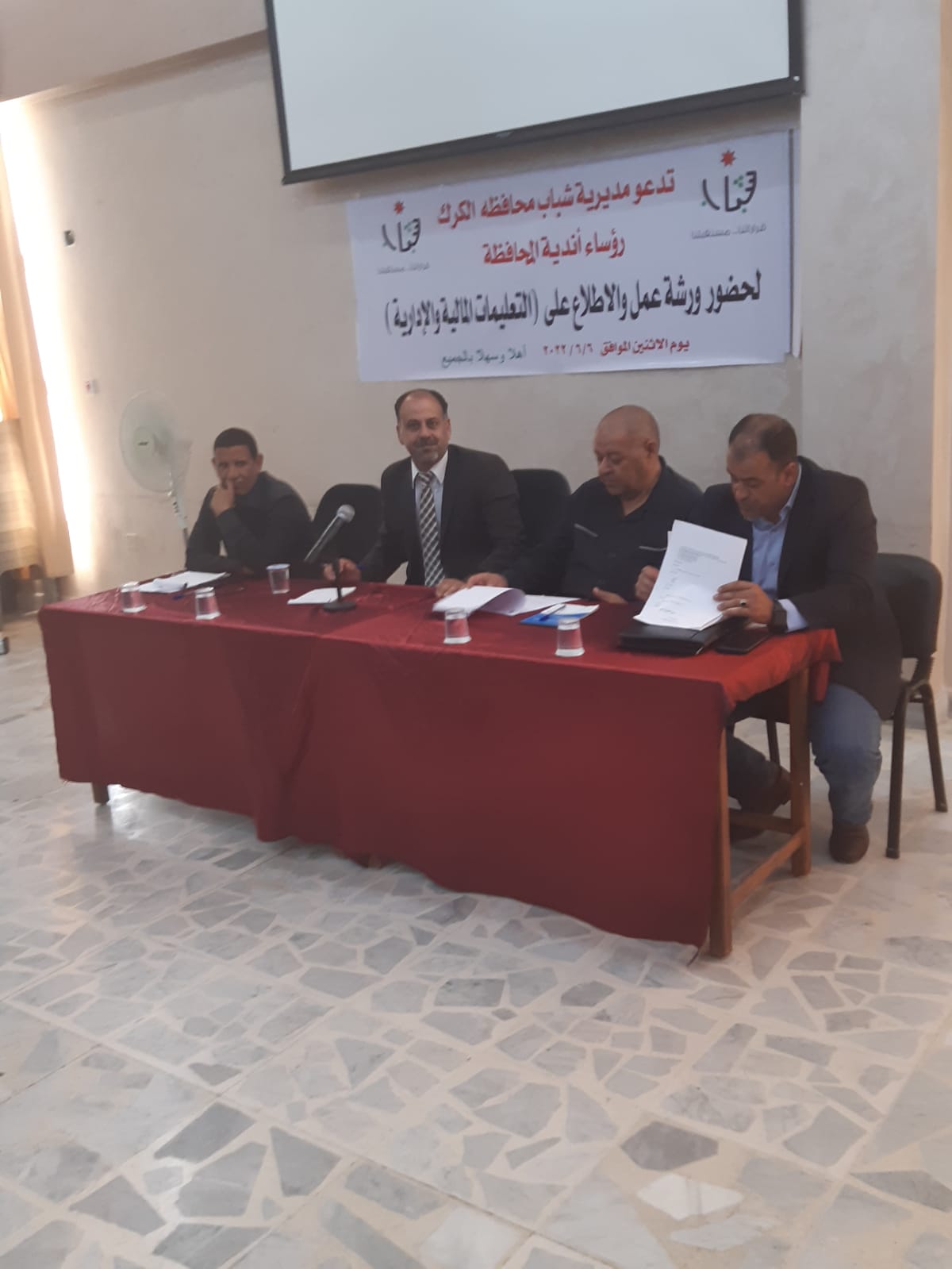 نظمت مديرية شباب الكرك ورشه تعريفه في التعليمات الماليه والاداريه للانديه في المحافظه حيث افتتح الجلسه الدكتور يعقوب الحجازين مدير مديرية شباب الكرك مرحبا في الحضور وبين أهمية عقد مثل هذه اللقاءات التي تثري العمل في الانديه وتعريفهم عن أهم التعديلات الجديده لنظام الانديه