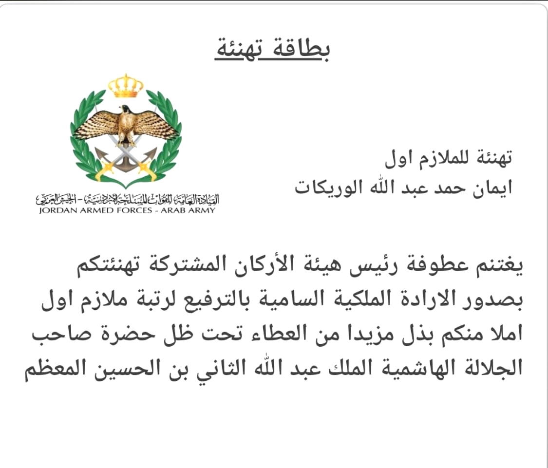 تتقدم الدكتورة مرام العبادي من الغالية ملازم اول ايمان الوريكات و زوجها النقيب الطبيب الدكتور احمد الزبون بأحر التهاني و التبريكات بمناسبة صدور الارادة الملكية السلمية بترفيعهما متمنيةً لهما مزيداً من التقدم و النجاح في ظل الراية الهاشمية