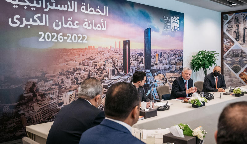 واطلع جلالة الملك، خلال لقائه بحضور رئيس الوزراء الدكتور بشر الخصاونة، أمين عمان وأعضاء مجلسها ومديريها التنفيذيين، على استراتيجية أمانة عمان الكبرى للسنوات الخمس المقبلة، مؤكدا أهمية تنفيذها بطريقة يلمس المواطن أثرها الإيجابي.