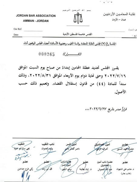 حدد مجلس نقابة المحامين موعد العطلة القضائية للمحامين الأردنيين لعام 2022 ابتداء من صباح يوم السبت الموافق 16 تموز 2022 حتى نهاية يوم الأربعاء 31 آب 2022.