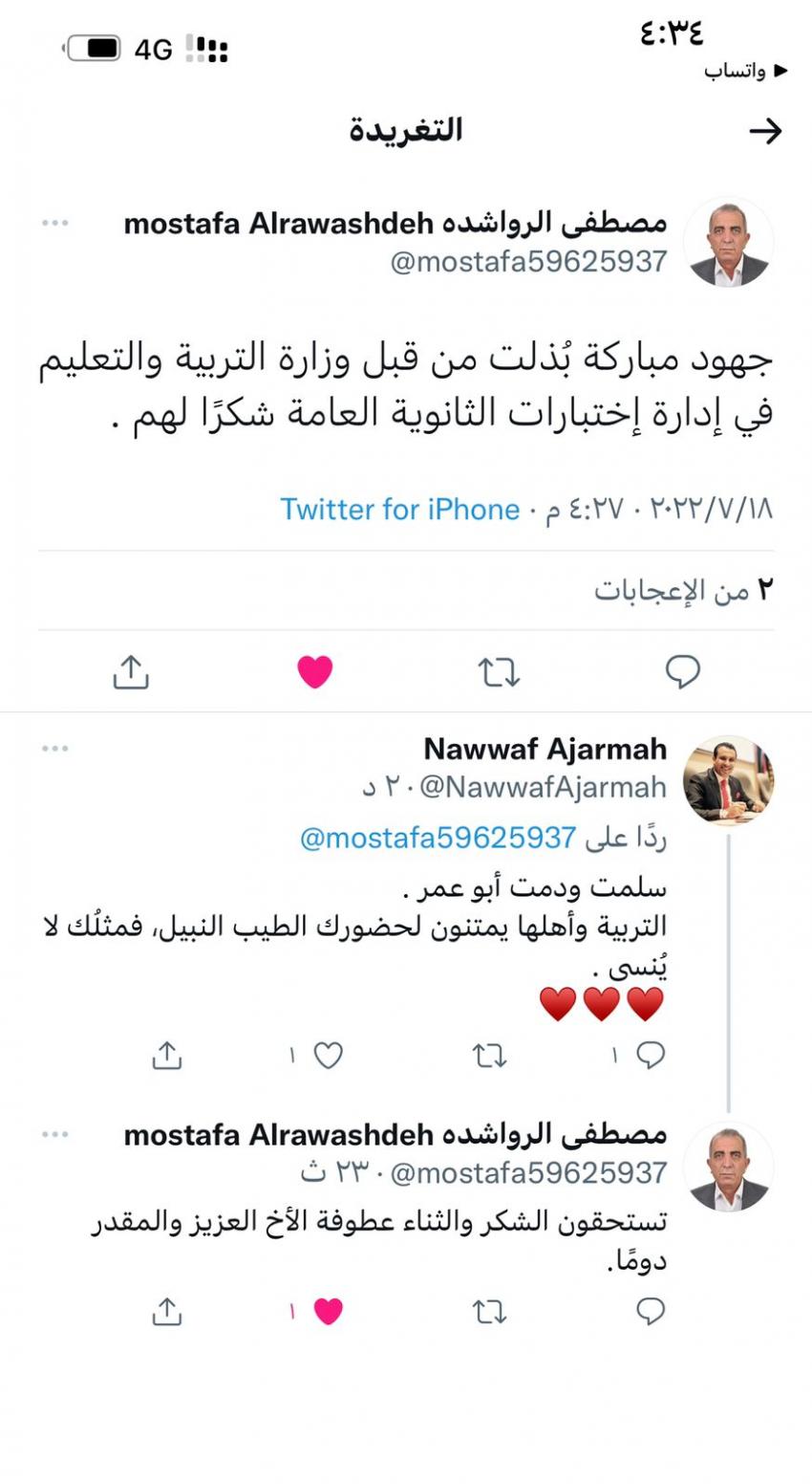 من جهته، رد أمين عام وزارة التربية والتعليم للشؤون الفنية والتعليمية، الدكتور نواف العجارمة في تعليق على التغريدة، “سلمت أبو عمر.. التربية وأهلها يمتنون لحضورك الطيب النبيل فمثلك لا ينسى.