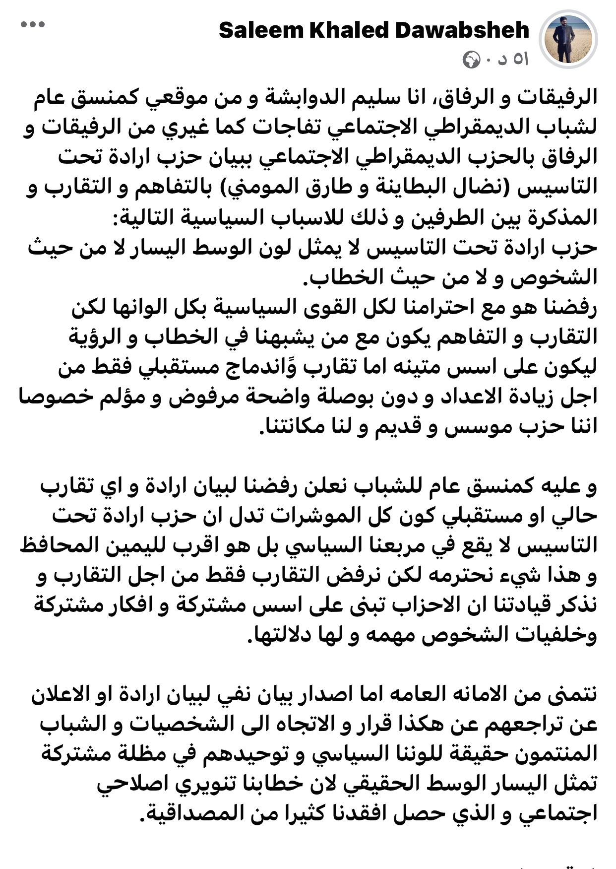 الرفيقات و الرفاق، انا سليم الدوابشة و من موقعي كمنسق عام لشباب الديمقراطي الاجتماعي تفاجات كما غيري من الرفيقات و الرفاق بالحزب الديمقراطي الاجتماعي ببيان حزب ارادة تحت التاسيس (نضال البطاينة و طارق المومني) بالتفاهم و التقارب و المذكرة بين الطرفين و ذلك للاسباب السياسية التالية: