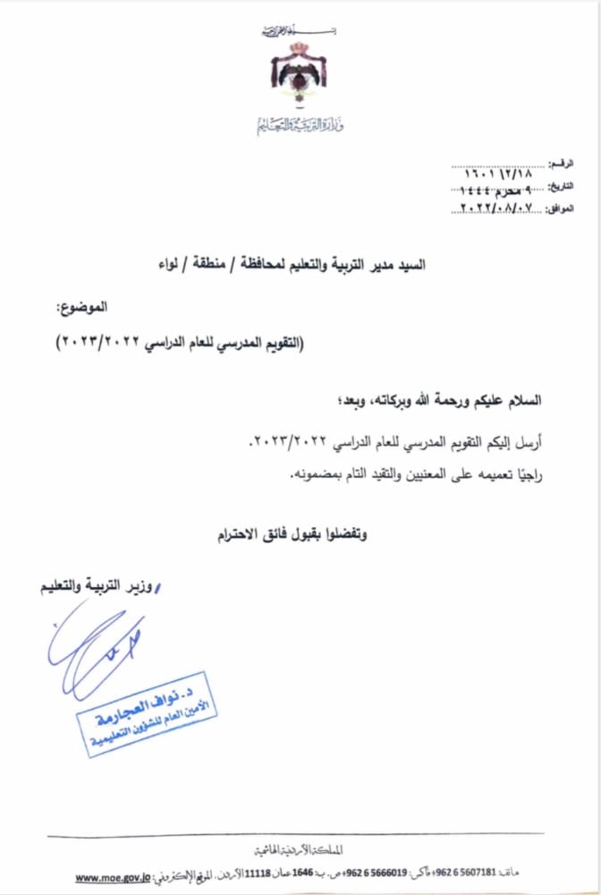 ويبدأ دوام الهيئات التدريسية للعام الدراسي ٢٠٢٢/٢٠٢٣ بحسب التقويم اعتبارًا من يوم الأربعاء ٢٤/٨/٢٠٢٢، وكذلك تسليم الكتب المدرسية للطلبة، وتسجيل المنقولين منهم، وأداء امتحانات الإكمال.