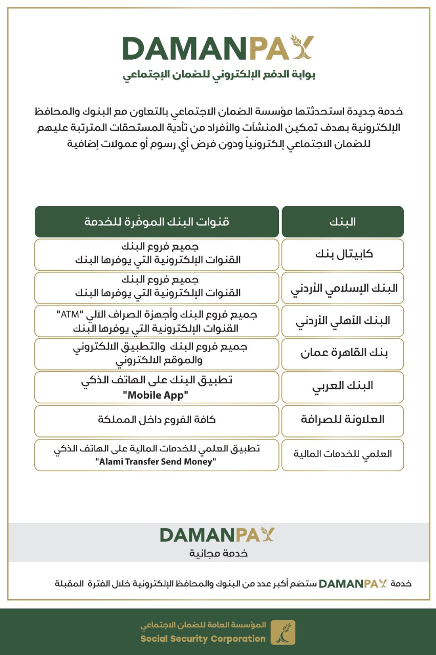 وأكدت المؤسسة على استمرارها في تطوير كافة قنوات الدفع الإلكتروني المجانية لخدمة جمهورها وتسهيل عملية دفع المستحقات للضمان الاجتماعي، مبينةً أن عدد الجهات المعتمدة حالياً في تقديم خدمة (Daman Pay) وصلت إلى سبعة جهات منها خمس بنوك وهي البنك الإسلامي الأردني وكابيتال بنك وبنك القاهرة عمان والبنك الأهلي الأردني والبنك العربي إضافة إلى فروع العلاونة للصرافة في كافة محافظات المملكة، والعلمي للخدمات المالية من داخل وخارج المملكة.