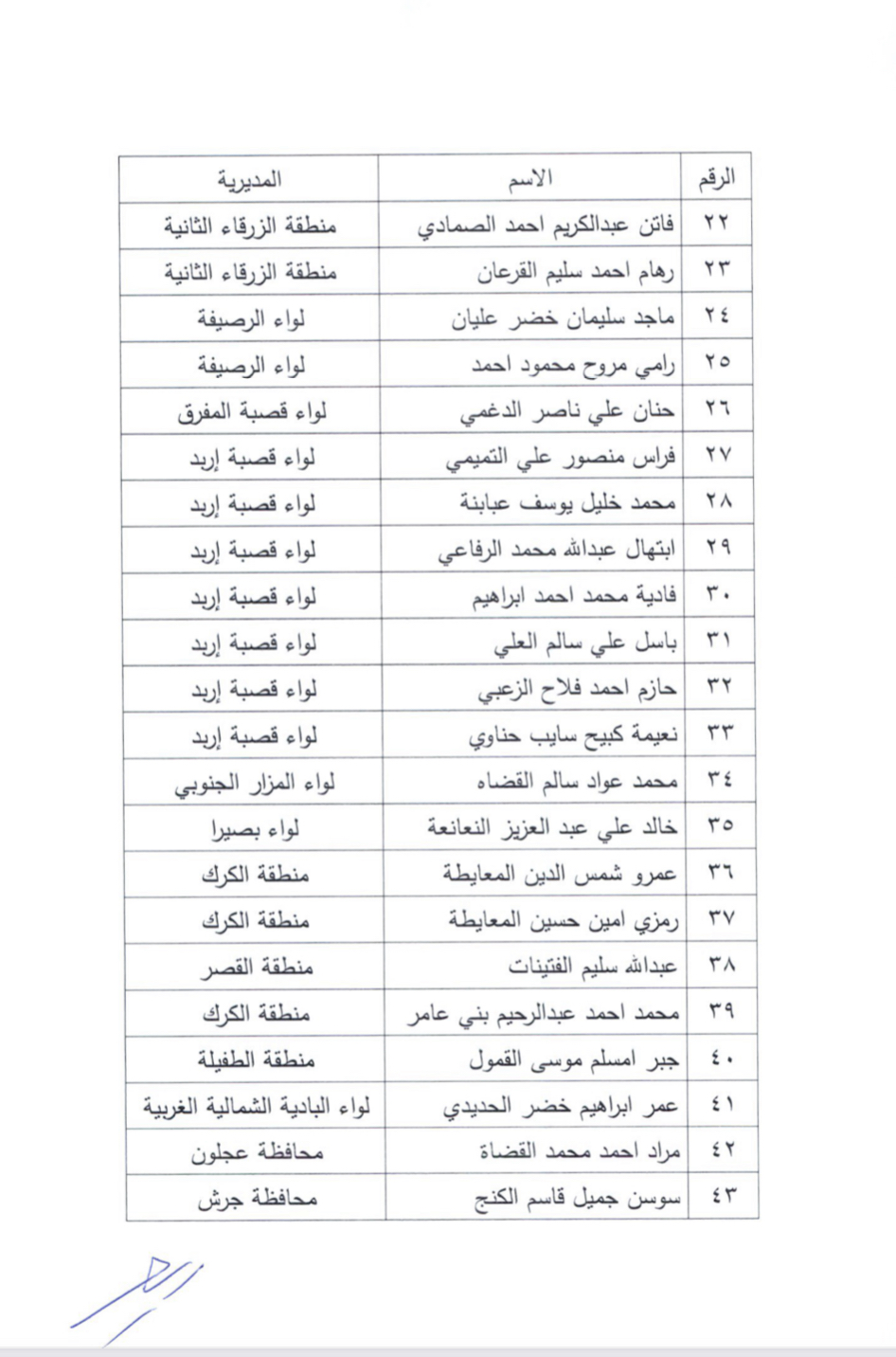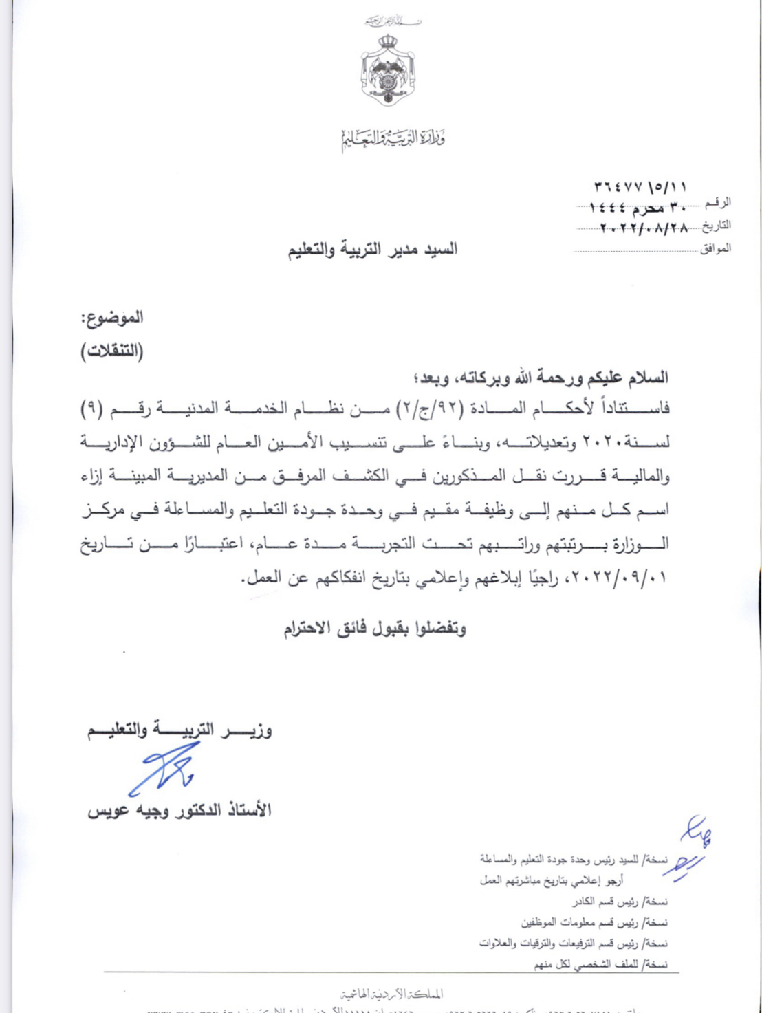 قرر الدكتور وجيه عويس وزير التربية والتعليم والتعليم العالي والبحث العلمي وبناءا على تنسيب امينة عام وزارة التربية للشؤون الادارية والمالية الدكتورة نجوى قبيلات نقل التالية اسماءهم من مراكز عملهم بمديريات الميدان برتبهم وراتبهم الى وحدة مراقبة جودة التعليم والمساءلة بمركز الوزارة لمدة عام وتحت التجرية ابتداءا من 1-9-2022