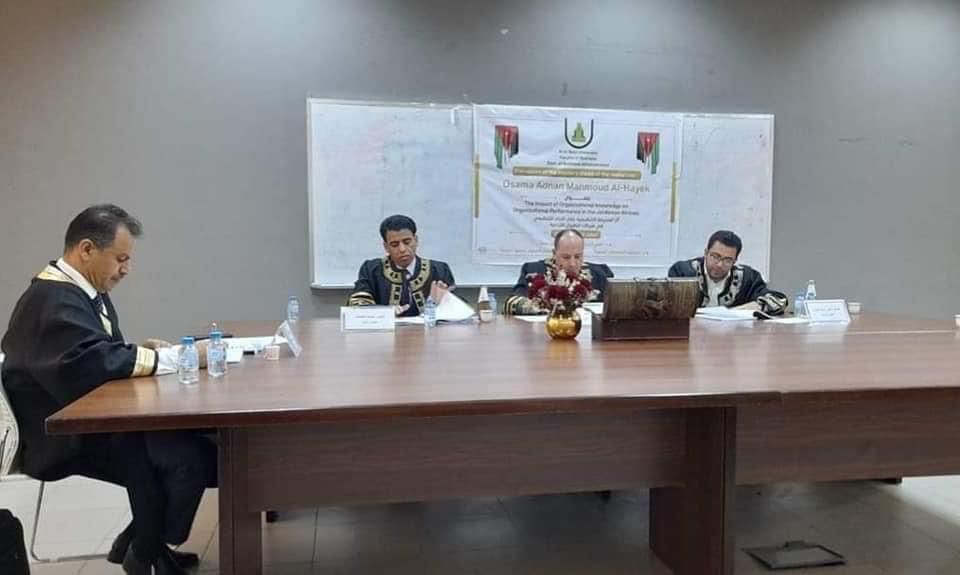 حصل الكابتن الطيَّار أسامة عدنان الحايك، أحد مرتَّبات طواقم الملكيَّة الأردنيَّة على درجة الماجستير في إدارة الأعمال من جامعة آل البيت، عن رسالته الموسومة بعنوان: The Impact of Organizational knowledge on Organizational Performance in the Jordanian Airlines (أثر المعرفة التَّنظيميَّة على الأداء التَّنظيمي في الخطوط الجويَّة الأردنيَّة).