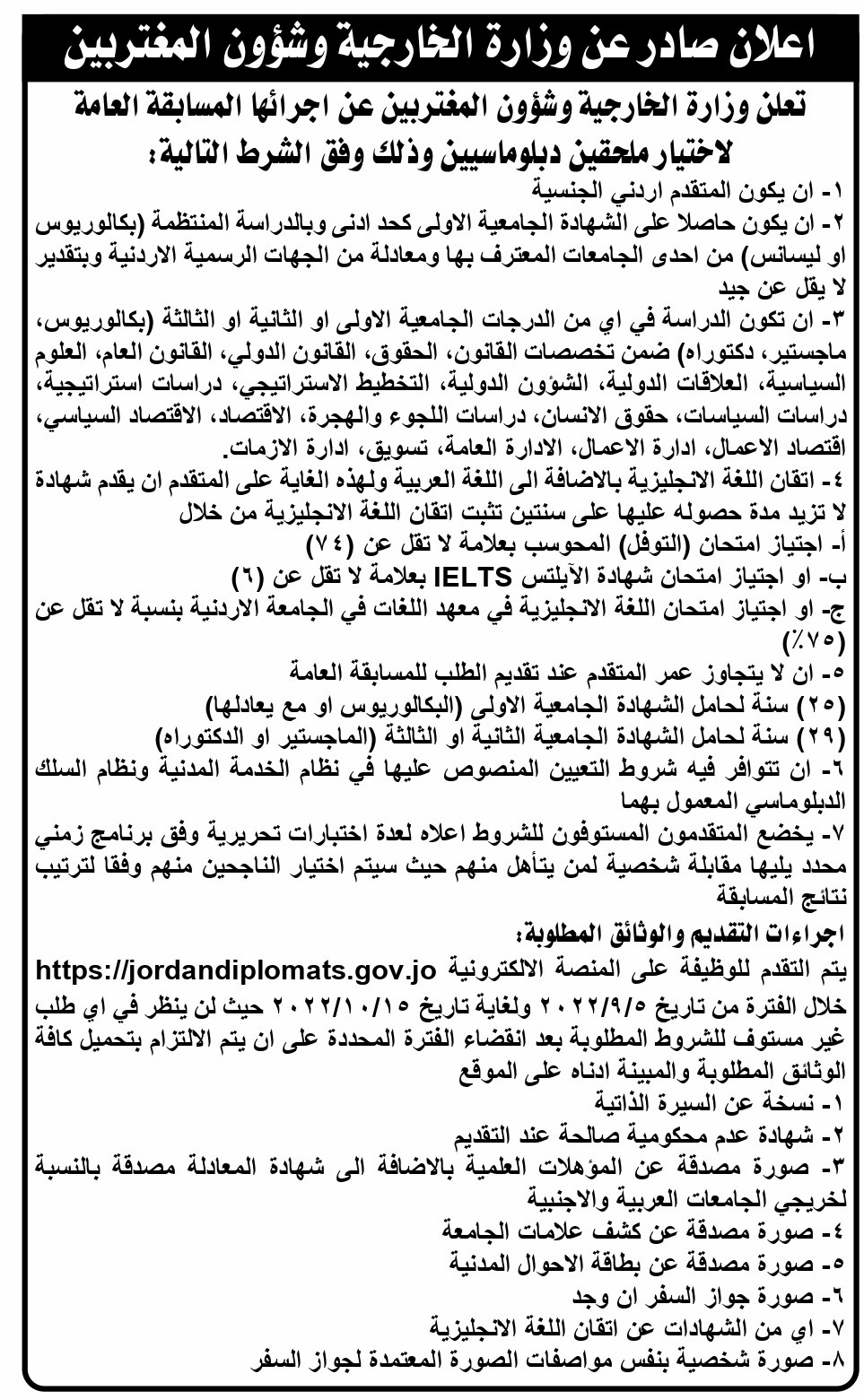 وتشترط الوزارة أن يكون المتقدم أردني الجنسية وحاصلا على الشهادة الجامعية الأولى كحد أدنى وبالدراسة المنتظمة ضمن تخصصات؛ القانون، الحقوق، القانون الدولي، القانون العام، العلوم السياسية، العلاقات الدولية، الشؤون الدولية، التخطيط الاستراتيجي، دراسات استراتيجية، دراسات السياسات، حقوق الإنسان، دراسات اللجوء والهجرة، الاقتصاد، الاقتصاد السياسي، اقتصاد الأعمال، إدارة الأعمال، الإدارة العامة، التسويق، وإدارة الأزمات.