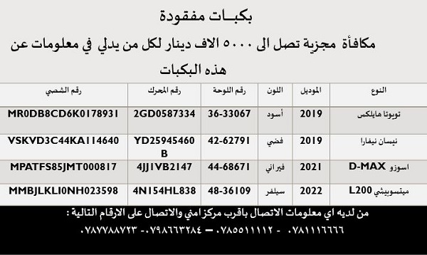 أكدت المحامية الأردنية، رنا القواسمة، تخصيص مكافأة مجزية تصل إلى 5 آلاف دينار، لمن يدلي بمعلومات عن "بيكبات" مفقودة منذ نحو شهر، بعدما تم تأجيرهم لشركة تبين لاحقا أنها وهمية.