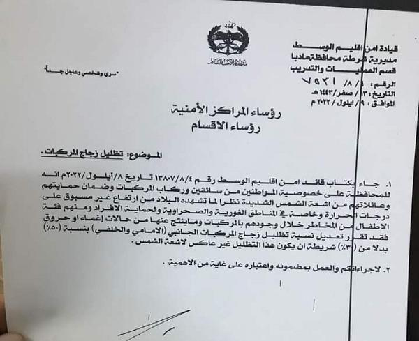 وبين المصدر ان القرار جاء للمحافظة على خصوصة المواطنين من سائقين وركاب وضمان حمايتهم وعائلاتهم من أشعة الشمس الشديدة لما تشهده البلاد من ارتفاع غير مسبوق على درجات الحرارة وخاصة في المناطق الغورية والصحراوية ولحماية الافراد ومنهم فئة الاطفال من المخاطر خلال وجودهم بالمركبات وما ينتج عهما من حالات اغماء أو حروق.