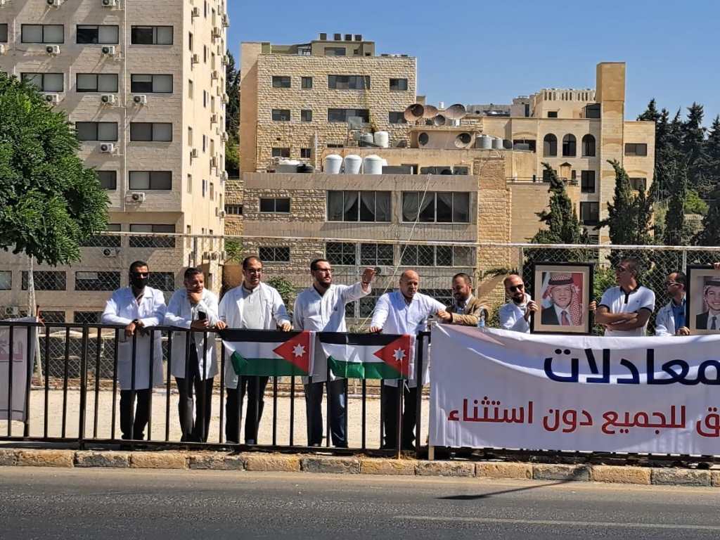 نفذ عدد من الأطباء حملة البورد الأجنبي داخل الأردن العاملين في مستشفيات وزارة الصحة، وقفة بالروب الأبيض أمام مجلس النواب وحملوا صورا للملك عبدالله الثاني بن الحسين، والأعلام الأردنية و يافطة كُتب عليها “المعادلات حق للجميع دون إستثناء”.