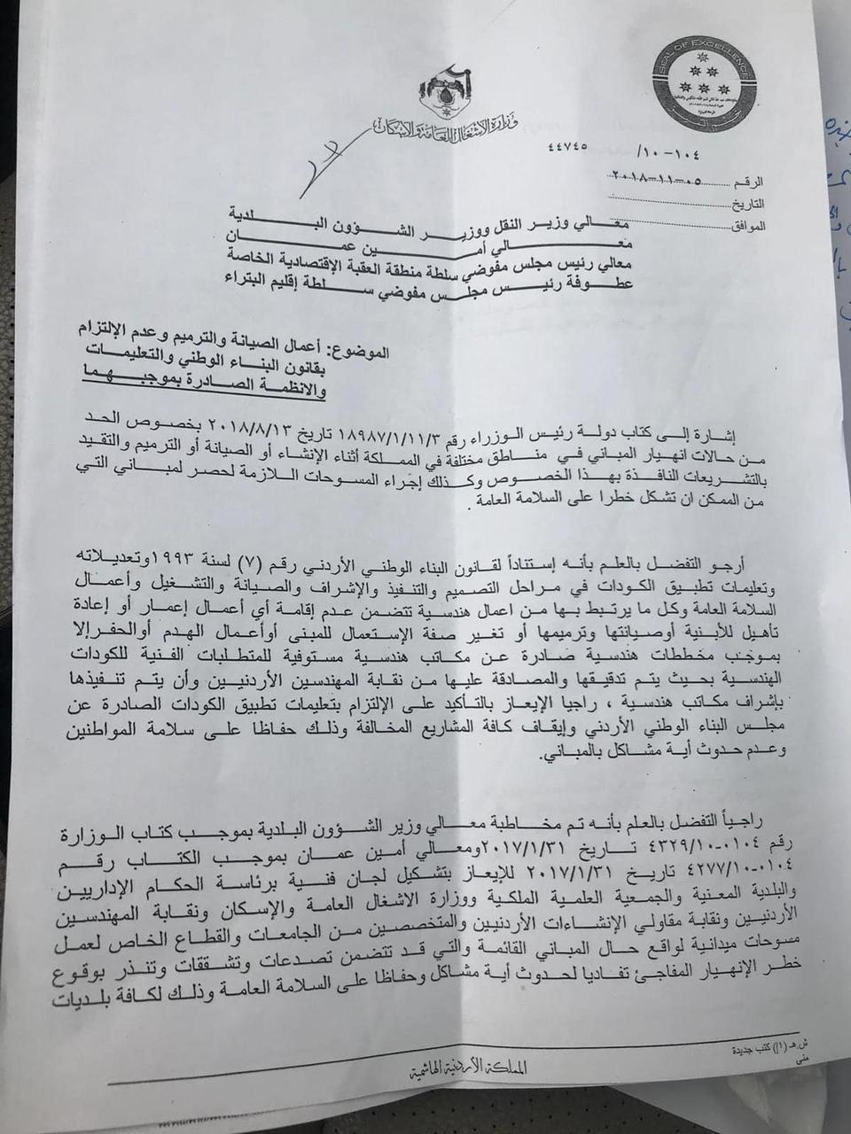 وبحسب الوثيقة الرسمية التي نشرها الناشط النقابي، المهندس ميسرة ملص، فإن مجلس البناء الوطني الذي يرأسه وزير الأشغال العامة والإسكان، وجّه كتابا إلى أمين عمان وغيره من الجهات الرسمية قبل حوالي (٤) سنوات، بخصوص الاجراءات الواجب اتخاذها إزاء الأبنية القديمة، وضرورة الكشف عليها للتحقق من متانتها أو عدم اجراء أي أعمال صيانة فيها دون مخططات هندسية أو اشراف هندسي، مع التقيد بالكودات الهندسية.