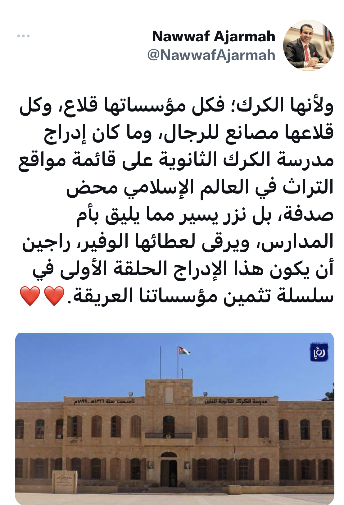 وقال أمين عام وزارة التربية نواف العجارمة على صفحات التواصل الاجتماعي : ولأنها الكرك ، وكل قلاعها مصانع للرجال، وما كان إدراج مدرسة الكرك الثانوية على قائمة مواقع التراث قي العالم الإسلامي محض صدفة ، بل نزر يسير مما يليق بأم المدارس ، ويرقى لعطائها الوفير، راجين هذا الإدراج الحلقة الأولى في سلسلة تثمين مؤسساتنا العريقة