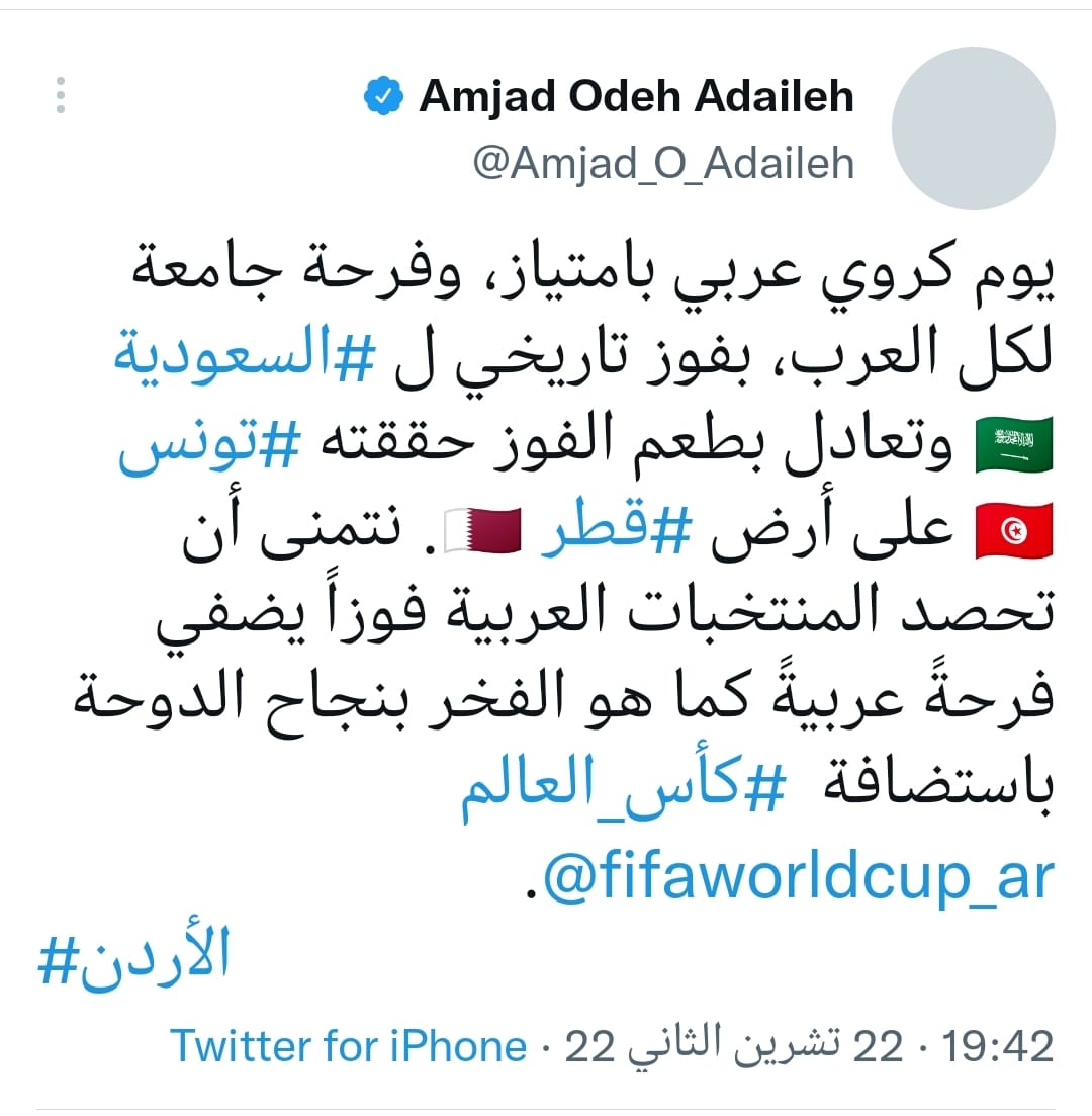 يوم كروي عربي بامتياز، وفرحة جامعة لكل العرب، بفوز تاريخي ل #السعودية?? وتعادل بطعم الفوز حققته #تونس ?? على أرض #قطر ??. نتمنى أن تحصد المنتخبات العربية فوزاً يضفي فرحةً عربيةً كما هو الفخر بنجاح الدوحة باستضافة #كأس_العالم @fifaworldcup_ar.