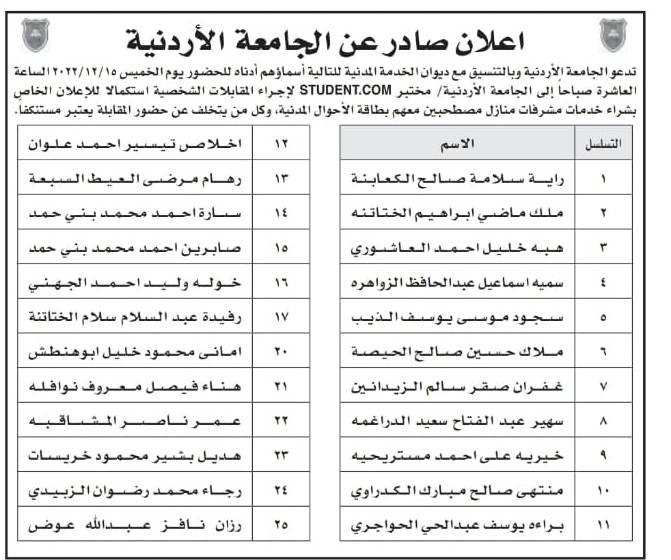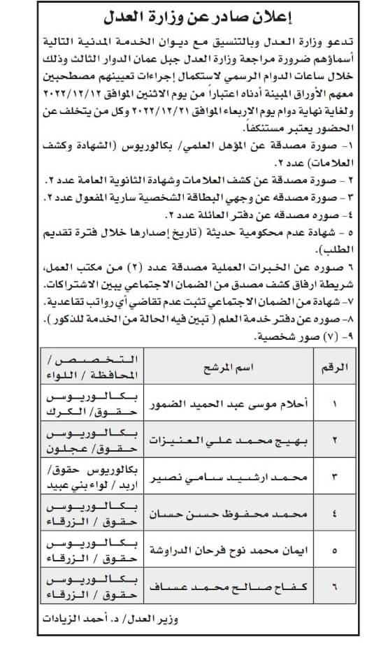 دعت عدد من الوزارات والمؤسسات الحكومية اليوم الإثنين، بالتنسيق مع ديوان الخدمة المدنية، عدداً من المرشحين للتعيين، مراجعة الوزارة لاستكمال إجراءات التعيين.