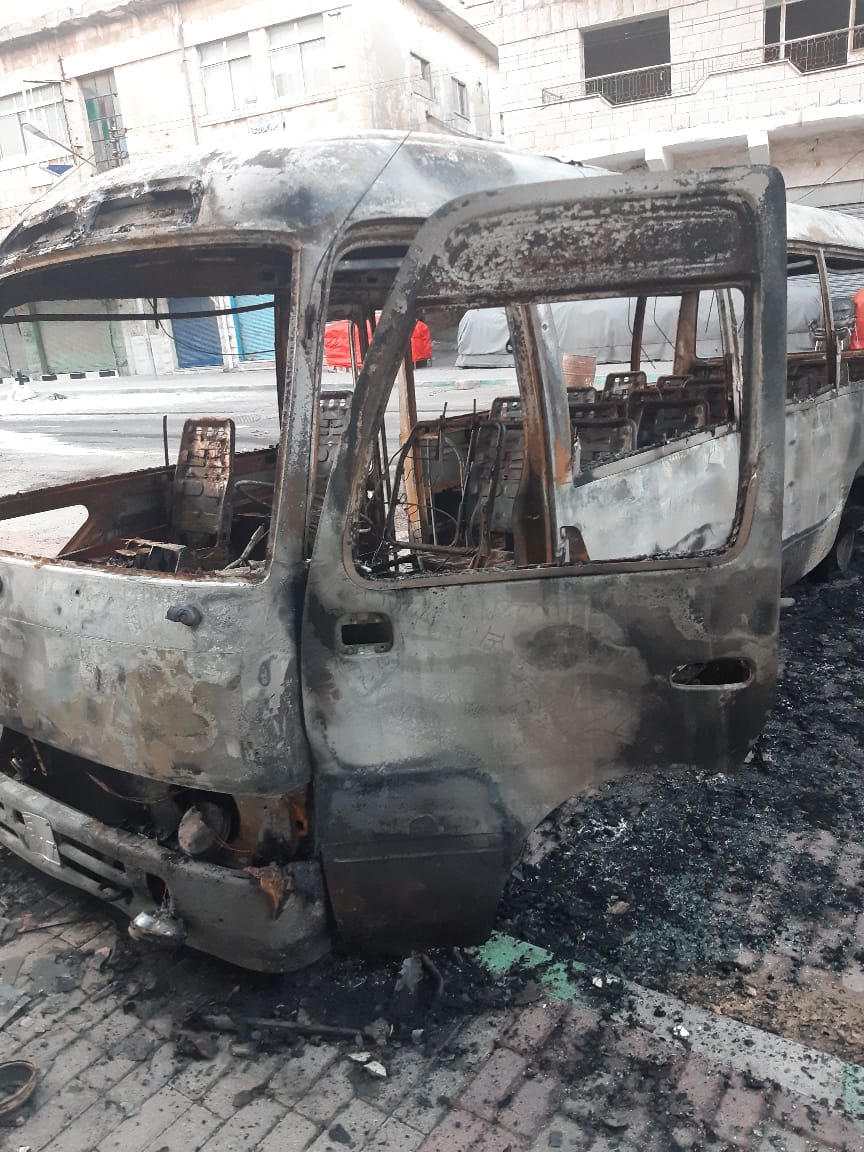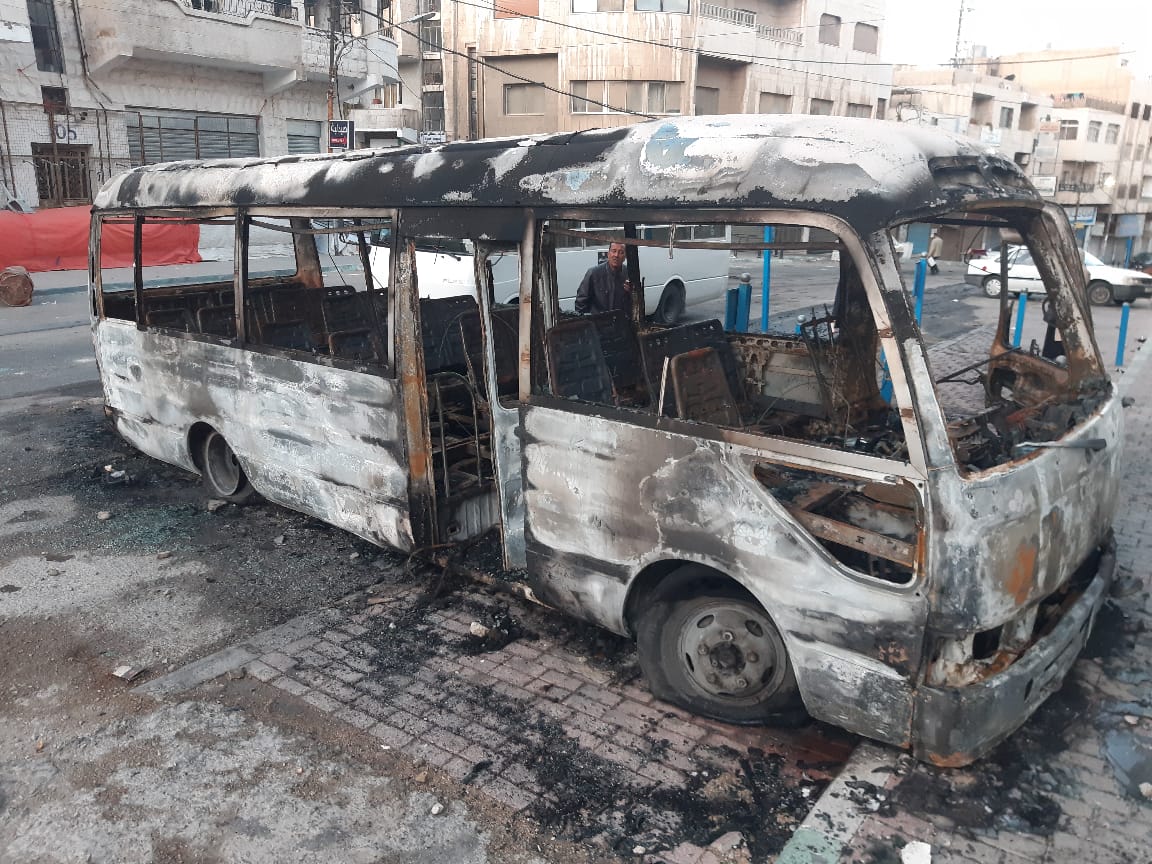 قام عدد من المحتجون بعد منتصف الليل باشعال اطارات تسببت في حرق كامل لاحد باصات التربيه والتعليم لمنطقة الكرك