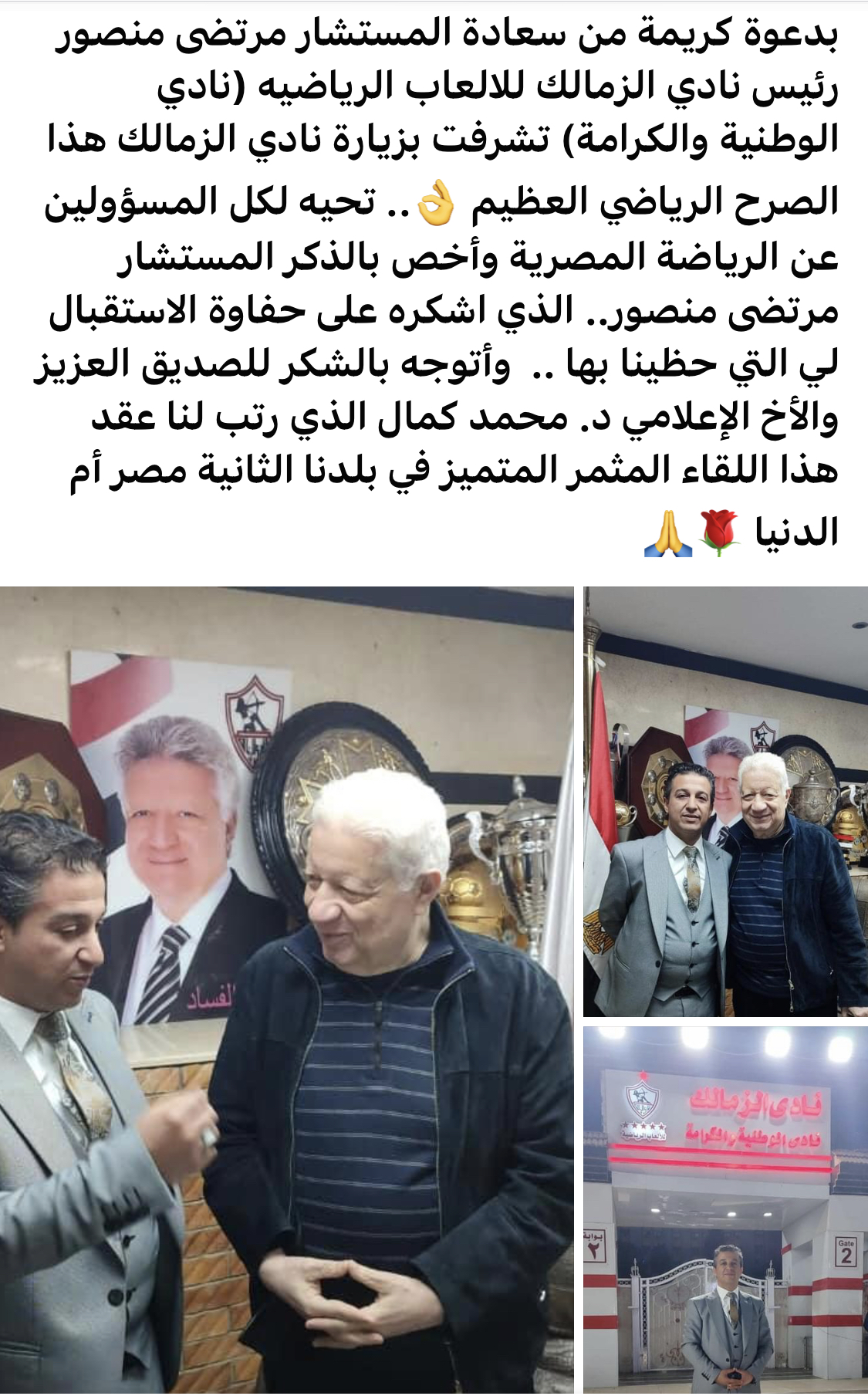 بدعوة كريمة من سعادة المستشار مرتضى منصور رئيس نادي الزمالك للالعاب الرياضيه (نادي الوطنية والكرامة) تشرفت بزيارة نادي الزمالك هذا الصرح الرياضي العظيم .. تحيه لكل المسؤولين عن الرياضة المصرية وأخص بالذكر المستشار مرتضى منصور.. الذي اشكره على حفاوة الاستقبال لي التي حظينا بها .. وأتوجه بالشكر للصديق العزيز والأخ الإعلامي د. محمد كمال الذي رتب لنا عقد هذا اللقاء المثمر المتميز في بلدنا الثانية مصر أم الدنيا