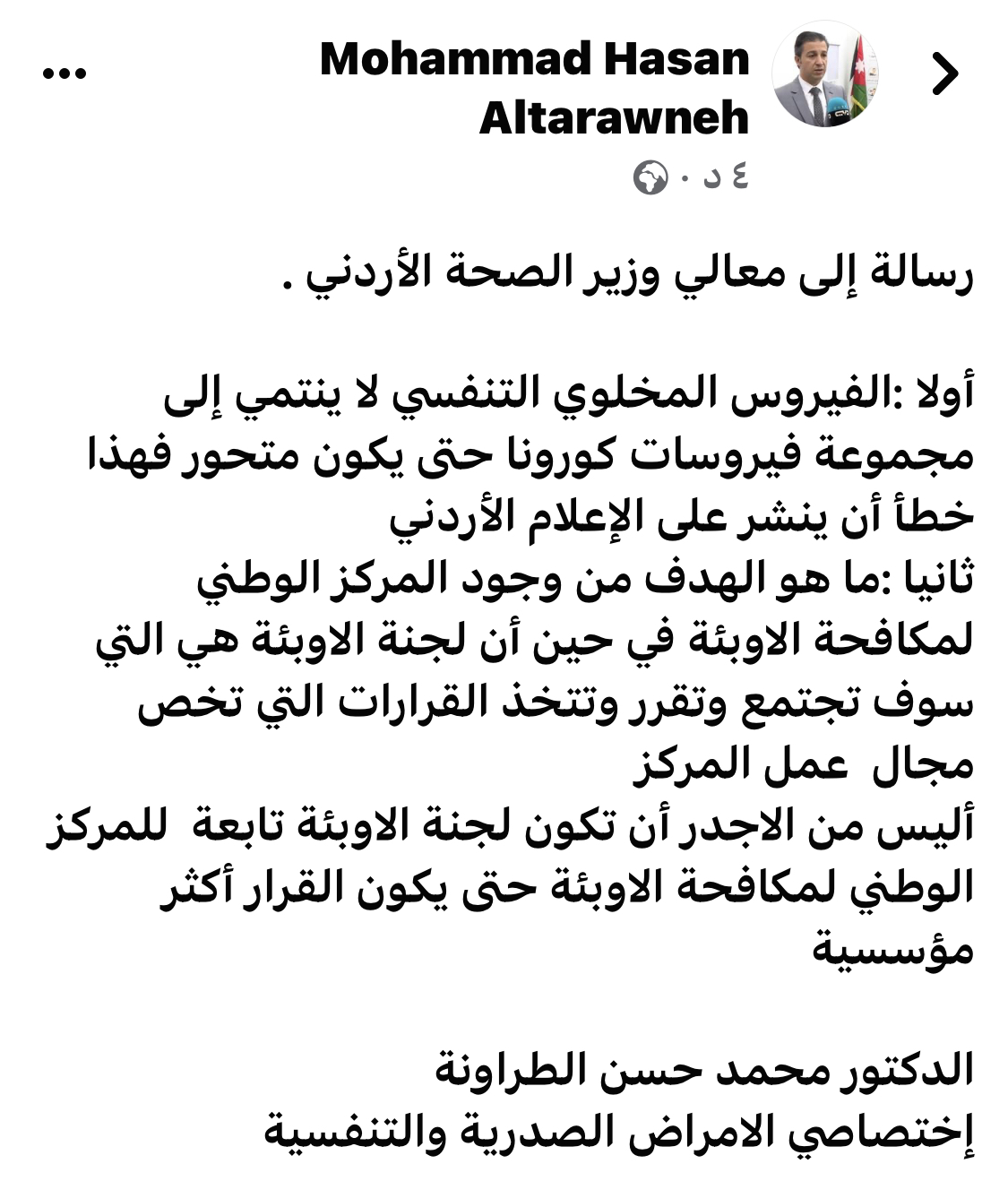 وجه الدكتور محمد حسن الطراونة اخصائي الصدرية رسالة لوزير الصحة الدكتور فراس الهواري عبر الفيسبوك جاء فيها :-