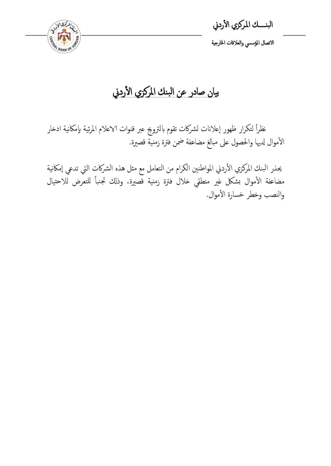 جدد البنك المركزي الأردني، تحذيره للمواطنين بعدم التعامل مع شركات تكرر ترويج الاعلانات عبر قنوات الاعلام المرئية وتدعي بامكانية ادخار الأموال لديها والحصول على مبالغ مضاعفة ضمن فترة زمنية قصيرة.