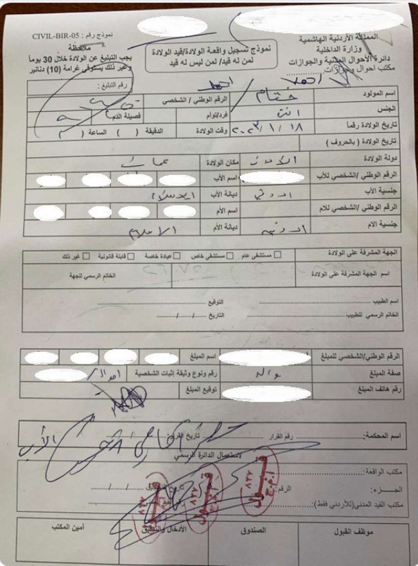 تقدم الينا المواطن (*) ورقمه الوطني (*) والدته ختام بطلب تسجيل واقعة الميلاد لابنته باعتبارها من مواليد 18/1/2023.