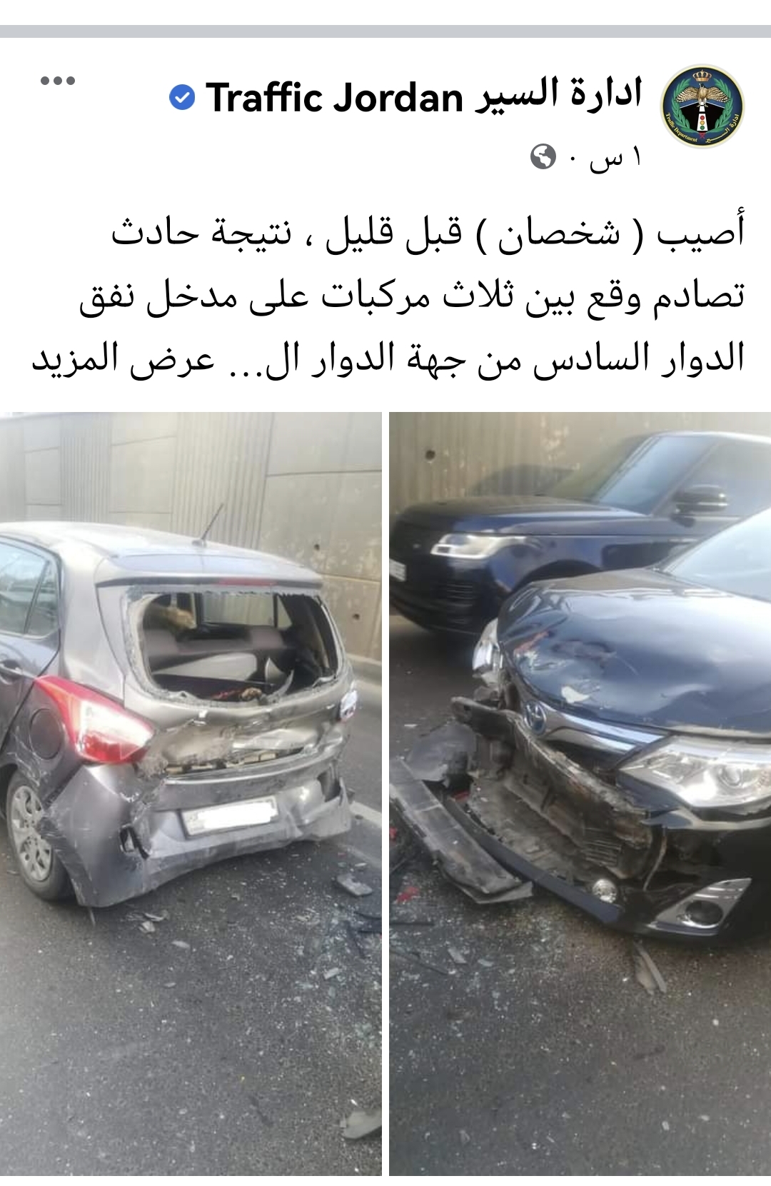 أصيب شخصان، مساء اليوم الإثنين، نتيجة حادث تصادم وقع بين ثلاث مركبات على مدخل نفق الدوار السادس من جهة الدوار السابع.