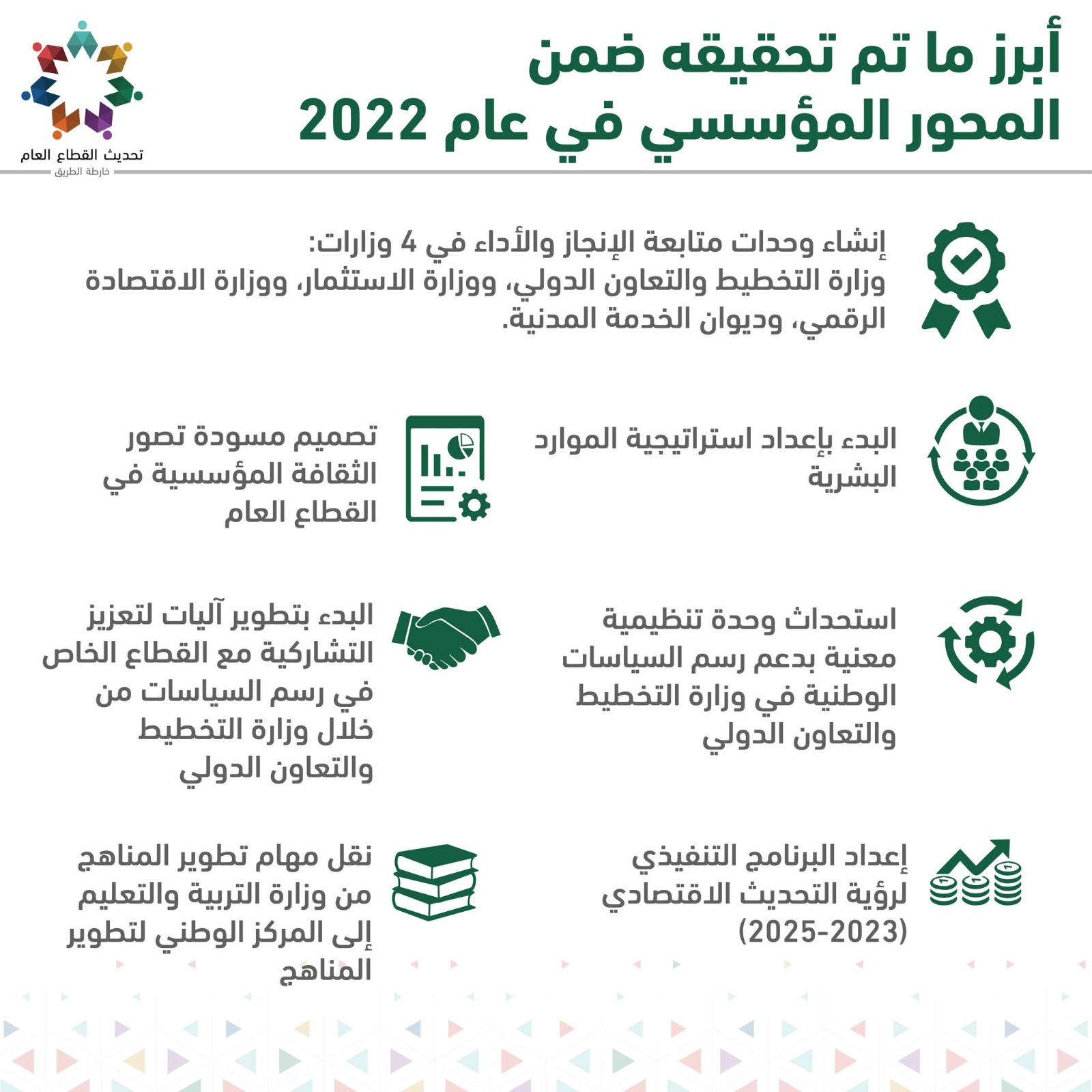 وأشار الشريدة في ما يتعلق بالمحور المؤسسي، إلى أنه جرى إنشاء وحدات متابعة الإنجاز والأداء في وزارات التخطيط والتعاون الدولي، والاستثمار، والاقتصاد الرقمي والريادة، وديوان الخدمة المدنية، إلى جانب البدء بإعداد استراتيجية الموارد البشرية لتكون وثيقة وطنية ومرجعية شاملة لجميع الخطط والبرامج المتعلقة بإدارة المورد البشرية في الأجهزة الحكومية، إلى جانب تصميم مسودة تصور الثقافة المؤسسية في القطاع العام.