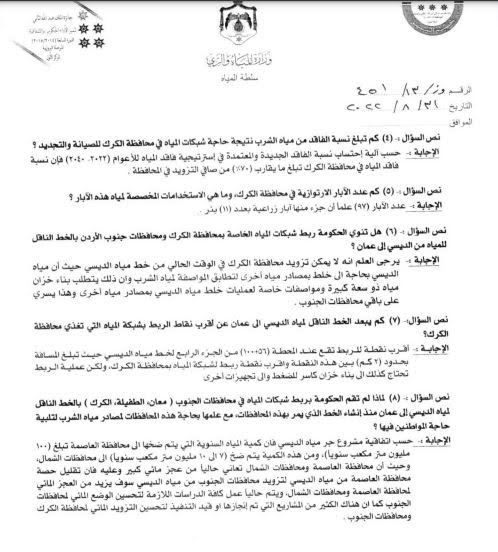 ولفت إلى حجم الاعتداءات المتكررة على خطوط المياه في الكرك، الأمر الذي ينعكس على التزويد المائي بالمحافظة.