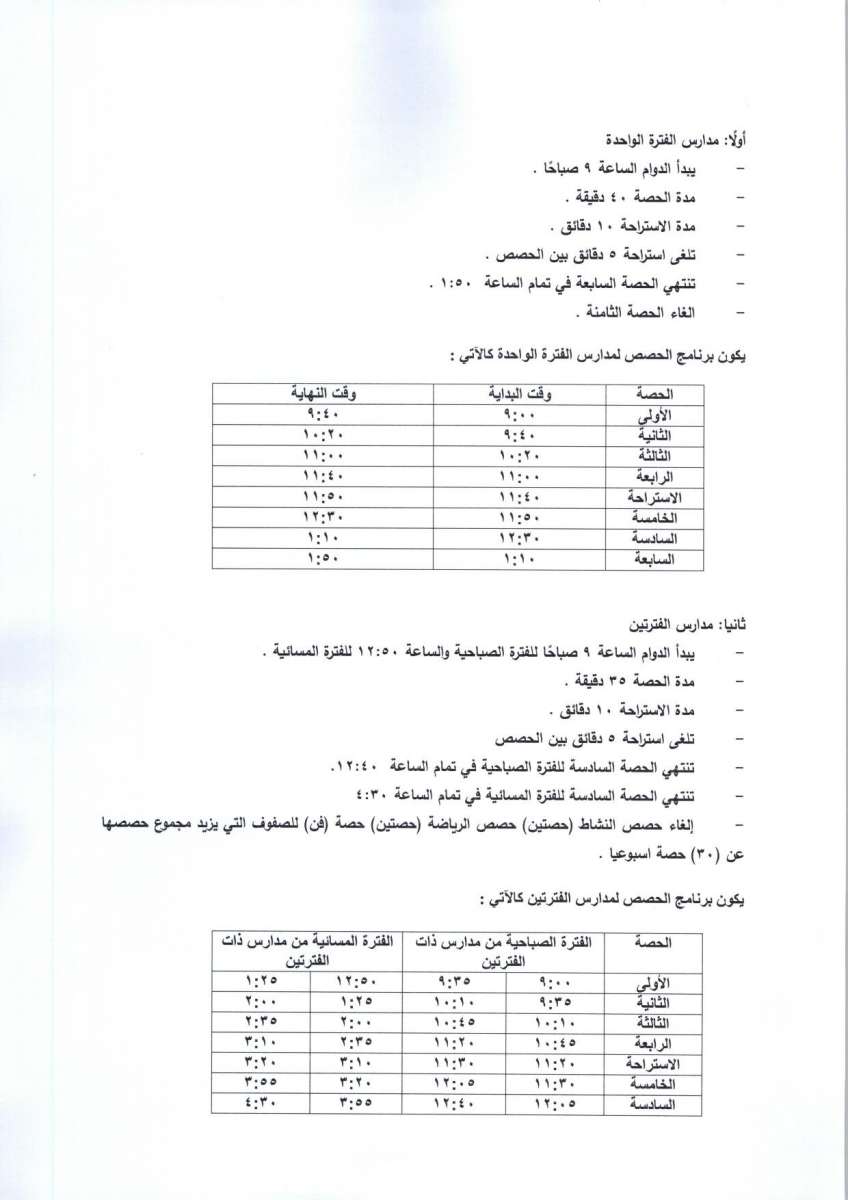 أما بالنسبة لدوام المدارس فتبدأ الحصة الأولى الساعة التاسعة صباحا، وتكون مدة الحصة الصفية في مدارس الفترة الواحدة (40) دقيقة وفي مدارس الفترتين (35) دقيقة، وإلغاء استراحة الخمس دقائق بين الحصص.