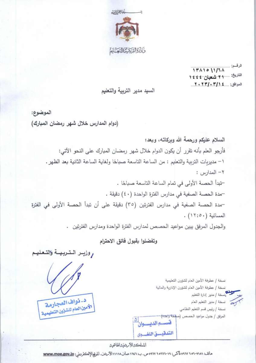 التربية تعلن تفاصيل اوقات الدوام خلال شهر رمضان