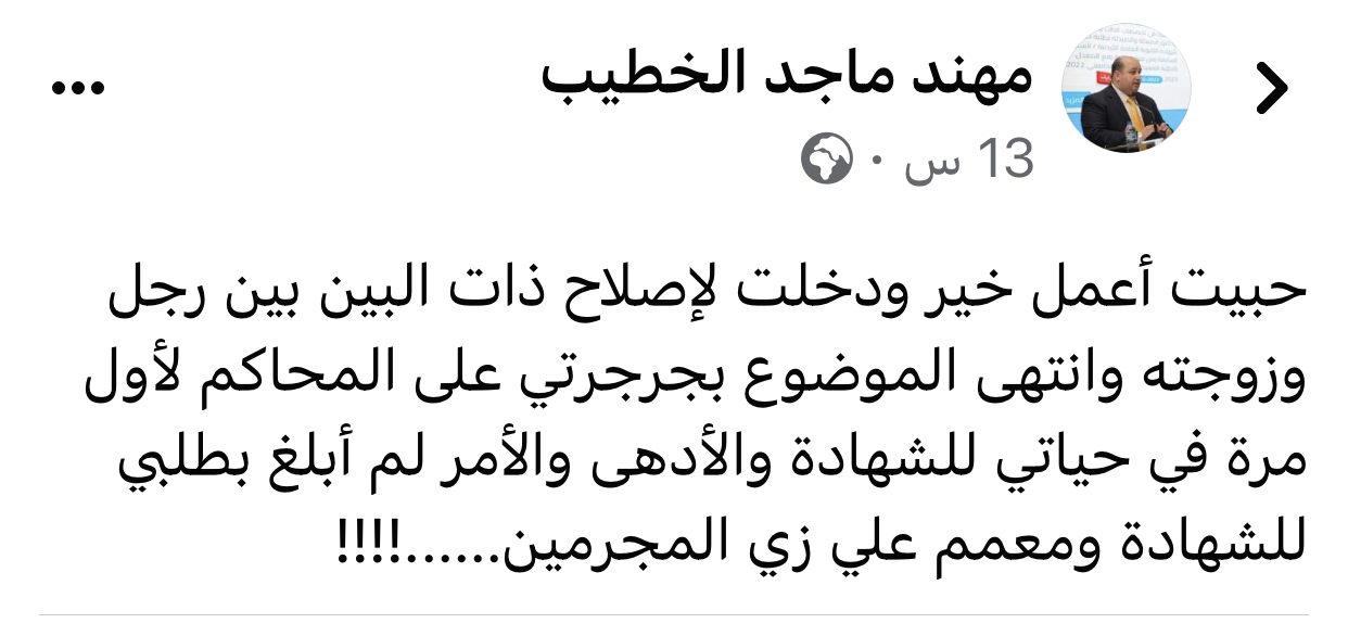 حبيت أعمل خير ودخلت لإصلاح ذات البين بين رجل وزوجته وانتهى الموضوع بجرجرتي على المحاكم لأول مرة في حياتي للشهادة والأدهى والأمر لم أبلغ بطلبي للشهادة ومعمم علي زي المجرمين……!!!!