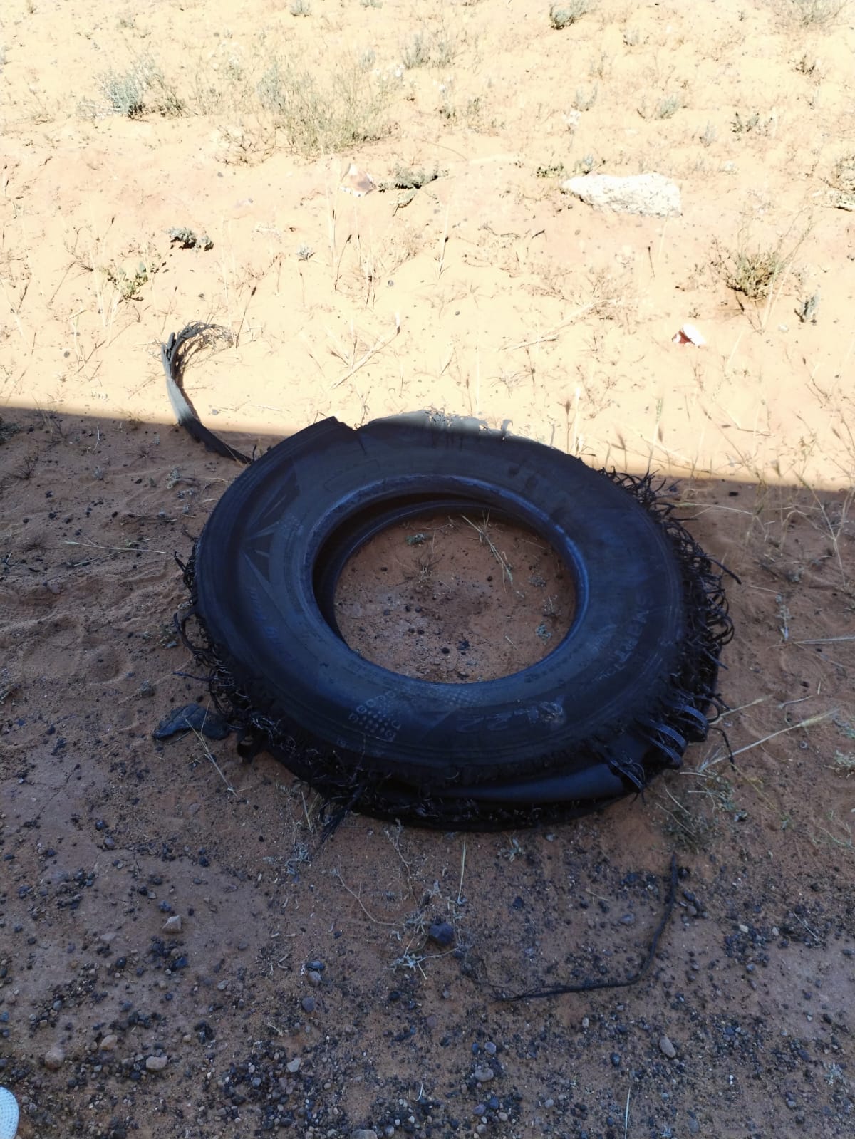 المفاجأة الأولى: هناك استهتار واضح لدى سائقي الشركات وليس الكل، فإن تذهب مسافة 1800 كيلومتر وتخرج من ارض الوطن وانت مصاب بالطمع والجشع من اجل تبديل كاوتشوك مهترئ واسلاكه خارجه من الاطار والسبير ايضا منفجر كما هو موضح بالصورة، كل هذا حتى يقوم هؤلاء السائقين بالتبديل بارض الحرمين وبيعها بالاردن او استبدالها لفارق بالسعر، أيعقل أن ينفجر معنا الاطارات ثلاث مرات متتالية بعد خروجنا من ارض الوطن ودخولنا بعد الحد السعودي وفي ارض خلاء صحراء ويبقى يمشي على الاطار المنفجر مسافة اكثر من 50 كلم ولم يكلف نفسه الوقوف والنزول لتفقد الاطار لانه كان يعلم ما سيحدث معه وعند انفجار الاطار الثاني قمنا بإلزامه بالتوقف لنطلب من الشركة تزويدنا بباص آخر كون هذا الباص لا يصلح للمسير على الطرقات.