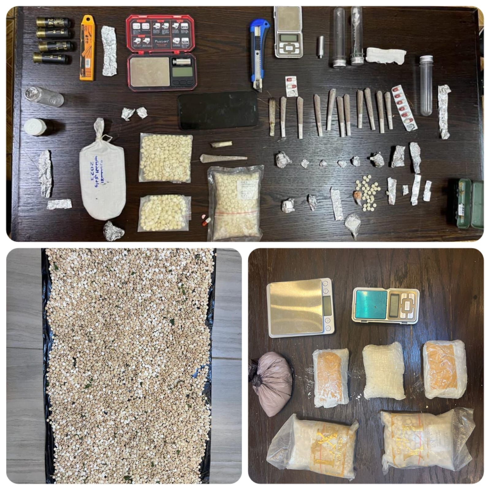كما وتم التعامل في محافظة المفرق والبادية الشمالية مع أربع قضايا أُلقي القبض فيها على أربعة تجار مروجين للمخدرات، إذ جرى في القضية الاولى ملاحقة تاجر للمخدرات اثناء نقله كمية كبيرة من الحبوب المخدرة، وجرى ايقاف المركبة والقاء القبض عليه وضبط بحوزته 50 الف حبة مخدرة ، كما ودوهم مكان وجود تاجر آخر في القضية الثانية والقي القبض عليه ، وضبط بحوزته نصف كيلو من مادة الكريستال و 1500 حبة مخدرة و 5 كفوف حشيش .