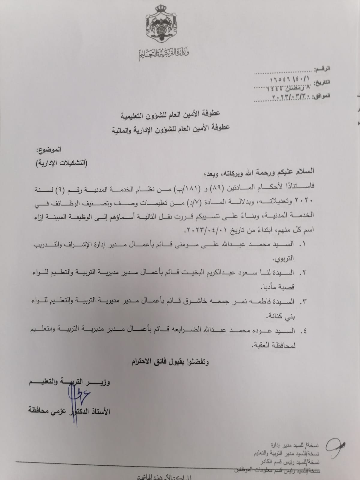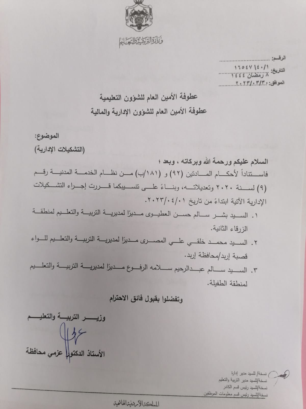 تشكيلات واحالات على التقاعد في وزارة التربية والتعليم
