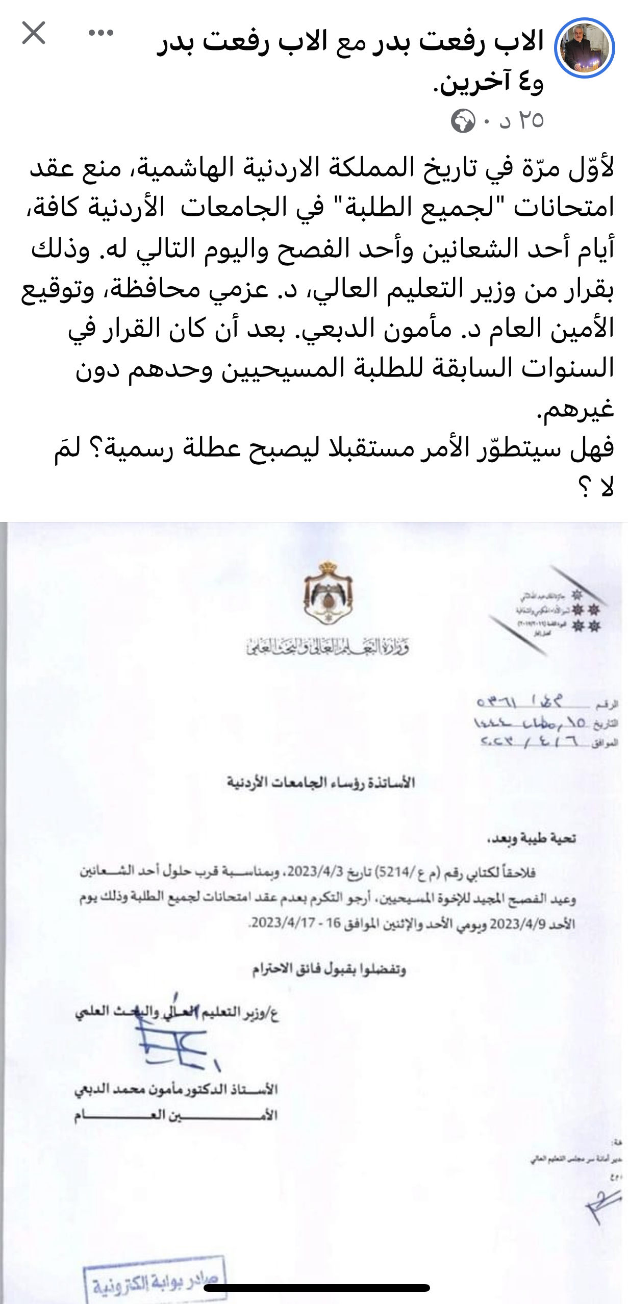 لأوّل مرّة في تاريخ المملكة الاردنية الهاشمية، منع عقد امتحانات "لجميع الطلبة" في الجامعات الأردنية كافة، أيام أحد الشعانين وأحد الفصح واليوم التالي له. وذلك بقرار من وزير التعليم العالي، د. عزمي محافظة، وتوقيع الأمين العام د. مأمون الدبعي. بعد أن كان القرار في السنوات السابقة للطلبة المسيحيين وحدهم دون غيرهم.
