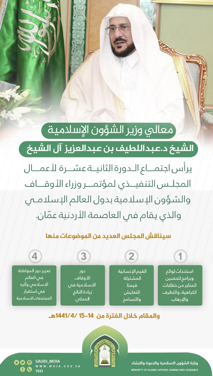 وصل معالي وزير الشؤون الإسلامية والدعوة والإرشاد رئيس المجلس التنفيذي لمؤتمر وزراء الأوقاف والشؤون الإسلامية بدول العالم الإسلامي الشيخ الدكتور عبداللطيف بن عبدالعزيز آل الشيخ، الى العاصمة الأردنية عمّان اليوم، ليترأس اجتماعات الدورة الثانية عشرة لأعمال المجلس، والتي ستقام غدا الخميس، برعاية دولة رئيس مجلس الوزراء الأردني الدكتور عمر الرزاز.