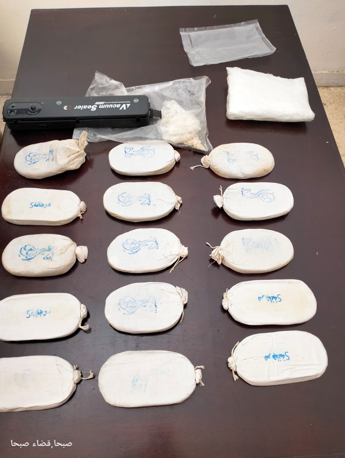 فيما داهمت قوة أمنية كذلك في البادية الشمالية تاجراً آخراً للمخدرات وأُلقي القبض عليه، وبتفتيش المنزل عُثر داخله على 15 كف من مادة الحشيش المخدرة وكمية كبيرة من الحبوب المخدرة .