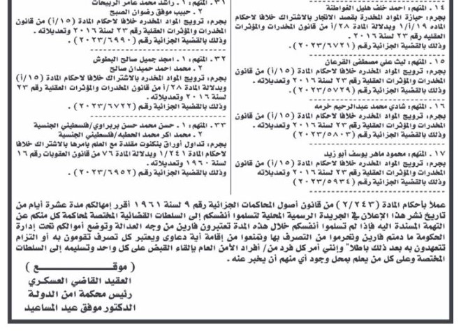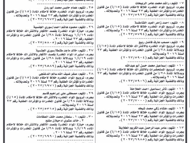 ونشرت المحكمة، اليوم الخميس، أسماء المتهمين، عملا بأحكام المادة 243 /2 من قانون أصول المحاكمات الجزائية رقم 9 لسنة 1961.
