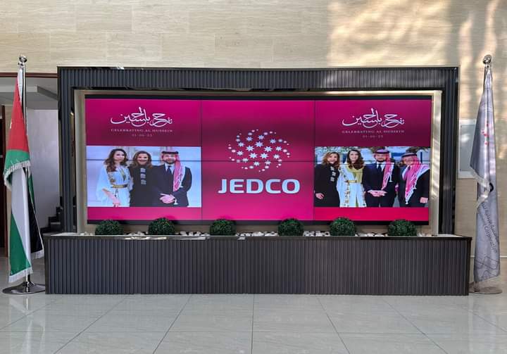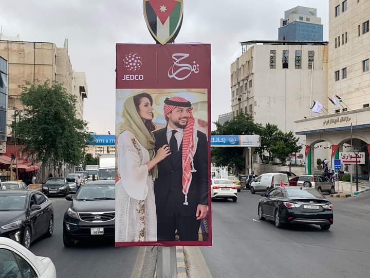 المؤسسة الأردنية لتطوير المشاريع الاقتصادية والشركات التابعة والشركاء من القطاع الخاص يزينون عدة مناطق بصور سمو الأمير الحسين ولي العهد وعروسته احتفالاً بزفافه الميمون.