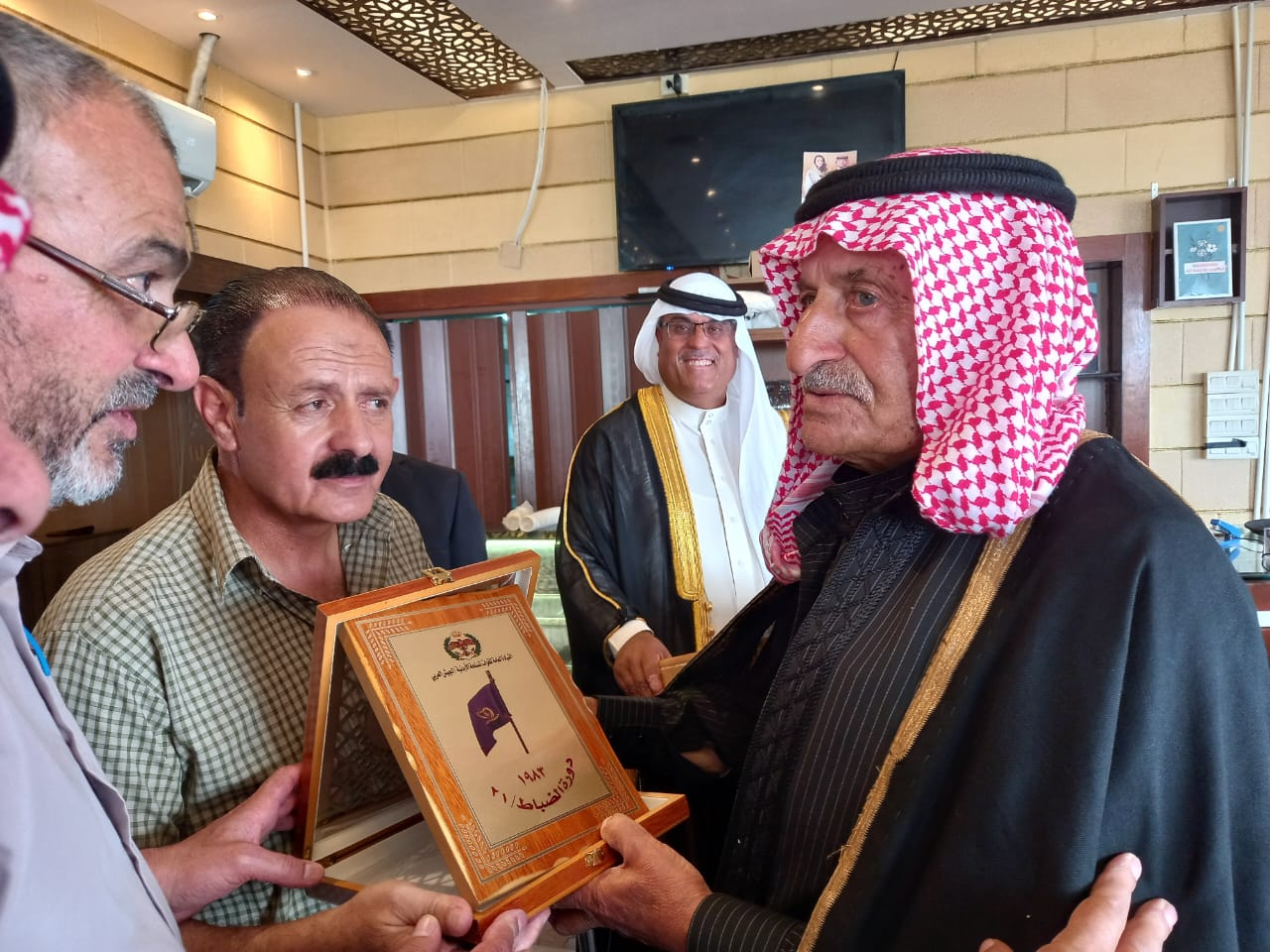 وحضر اللقاء ضيفا عزيزا على الجميع وهو كذلك متقاعد عسكري كان مدربا لهذه الدوره قبل ٤٠ عاما حيث تم تكريمه بدرع الدوره بعد ان القى كلمه رحب من خلالها بالضيوف الكرام ضيوف الكرك