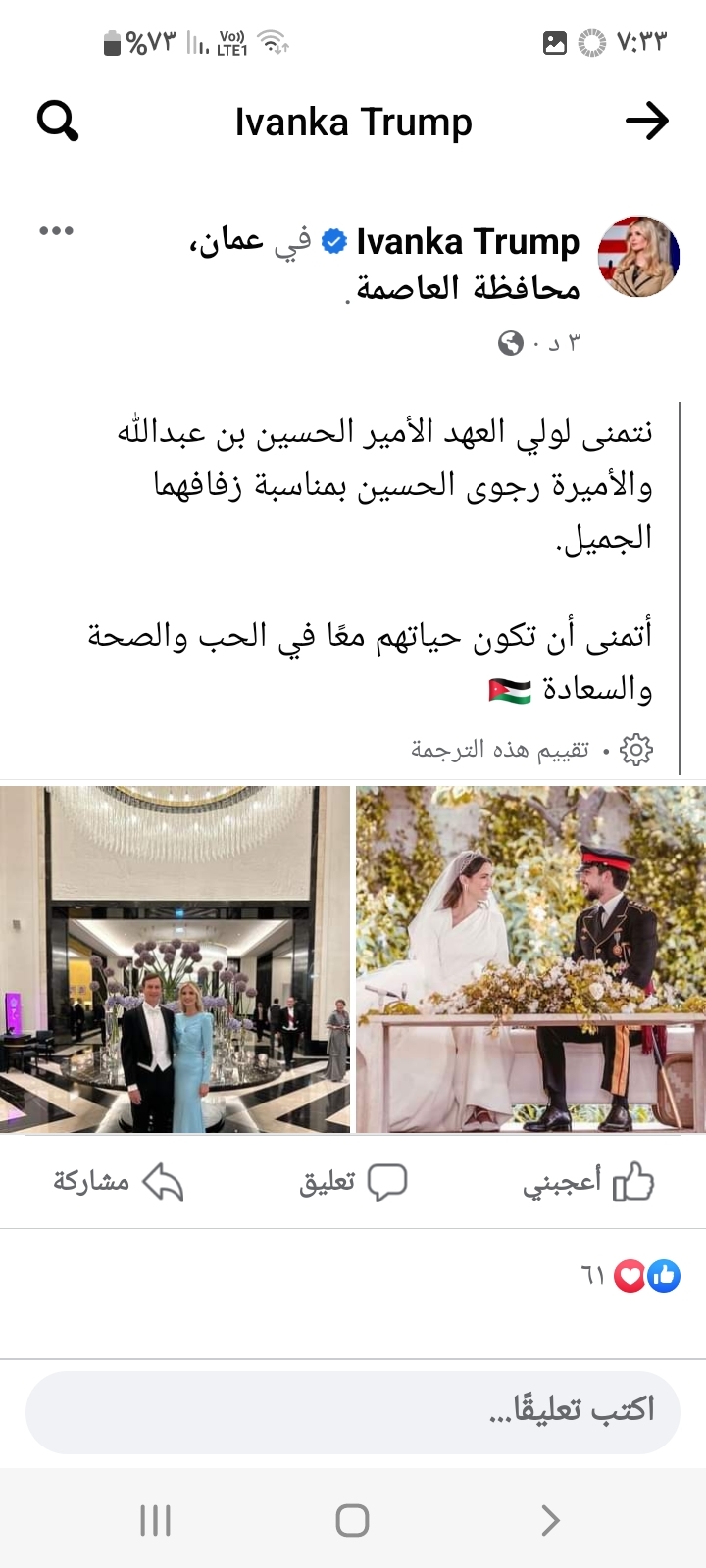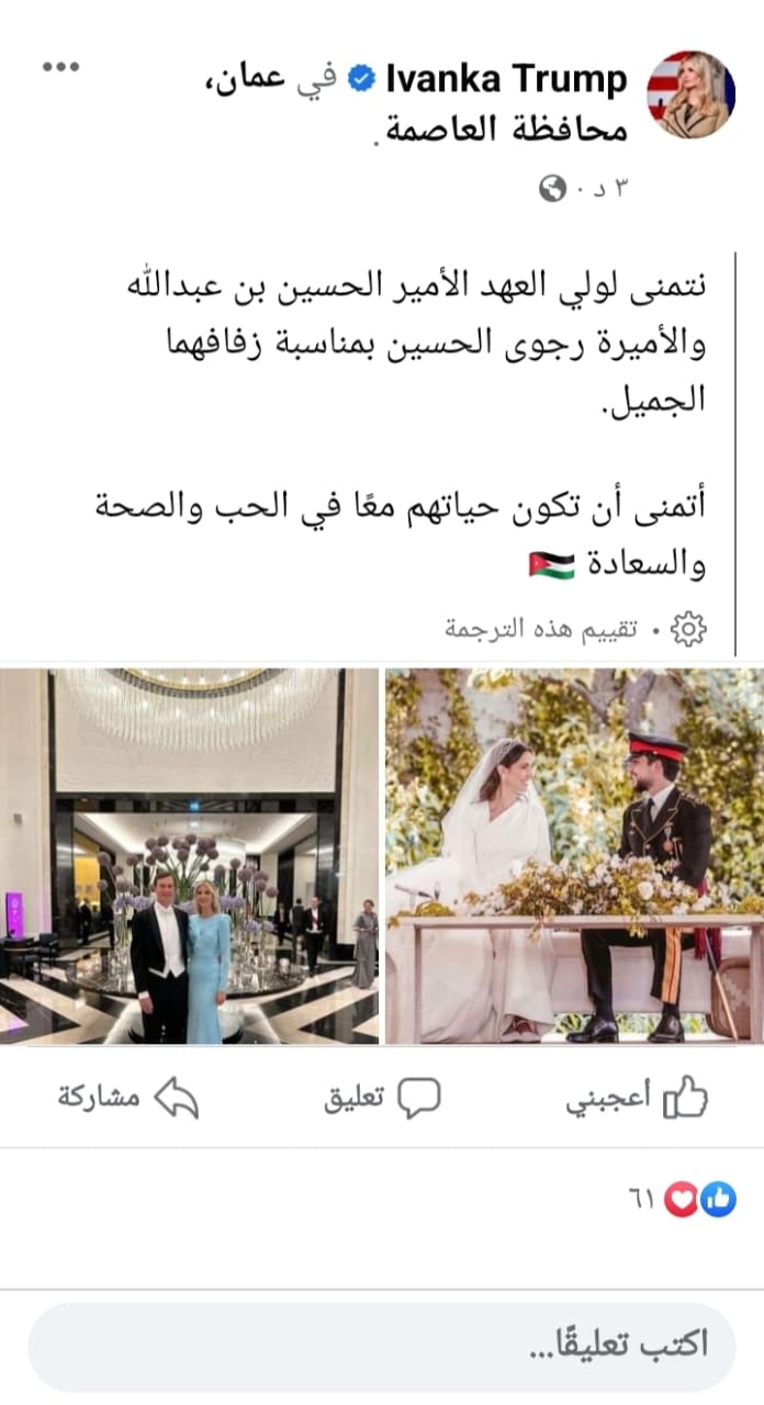 إيفانكا ترامب لولي العهد وألاميرة رجوة : أتمنى أن تكون حياتهم معاً في الحب والصحة والسعادة