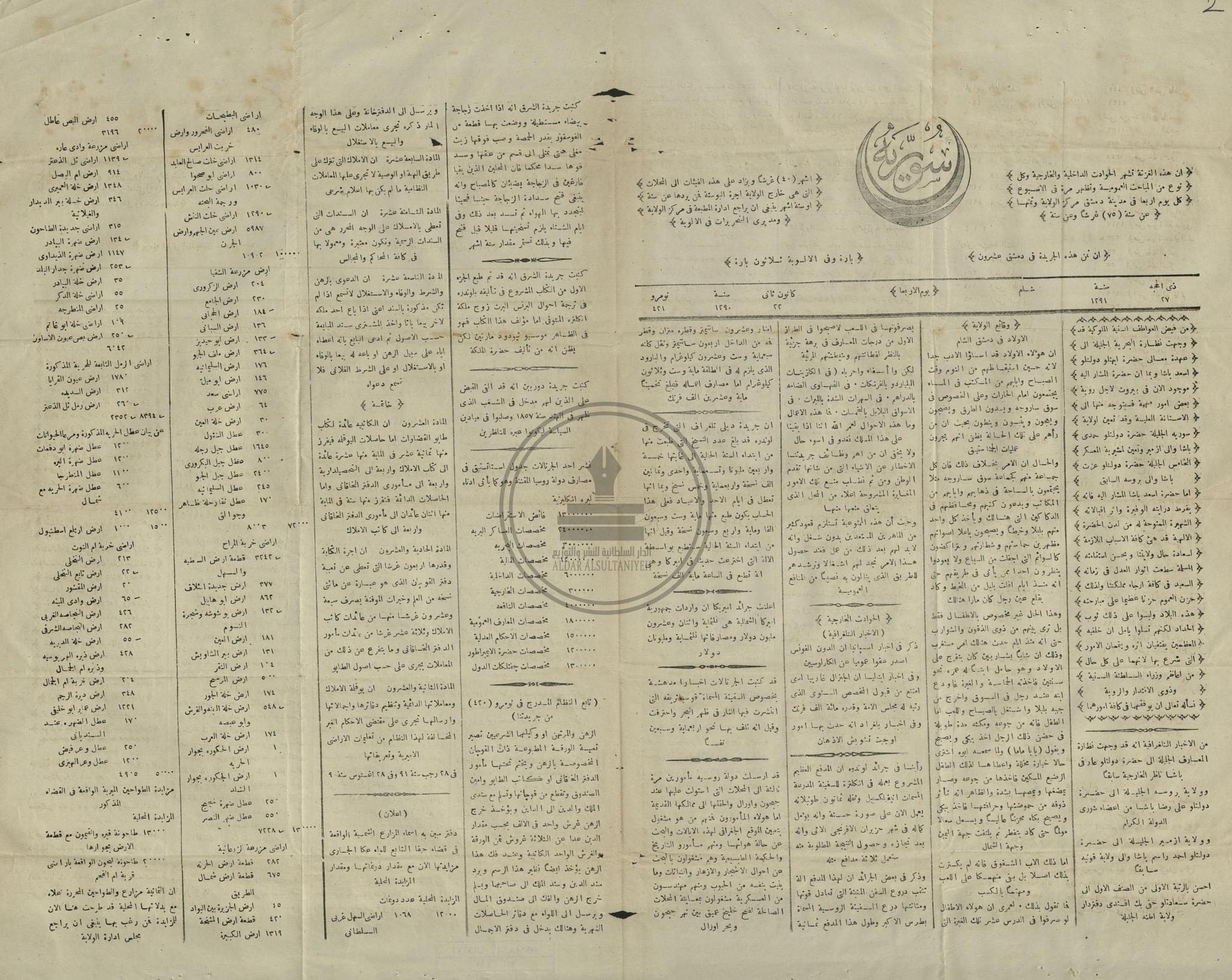 في وثيقتنا هذه وهي للعدد ( 421) وتاريخه ( 1291هـ - 1875) كتبت الجريدة على ترويستها ( إن هذه الغزتة " الجريدة" تشهر الحوادث الداخلية والخارجية وكل نوع من المباحث العمومية وتظهر مرة في الأسبوع كل يوم أربعاء في مدينة دمشق مركز الولاية وثمنها عن سنة 75 غرشا وعن ستة أشهر 40 غرشاً ويزاد على هذه الفئات إلى المحلات التي هي خارج الولاية أجرة البوستة …)
