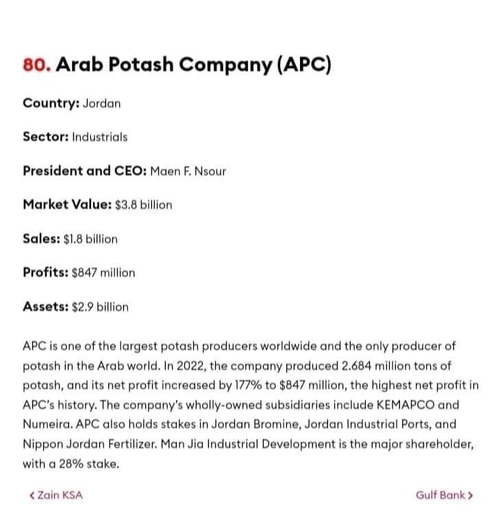وأشارت مجلة "فوربس" إلى أن شركة البوتاس العربية كانت قد بلغت قيمتها السوقية 3.8 مليار دولار مع نهاية العام 2022، فيما بلغت مبيعاتها 1.8 مليار دولار، أما أرباحها فقد بلغت 847 مليون دولار،