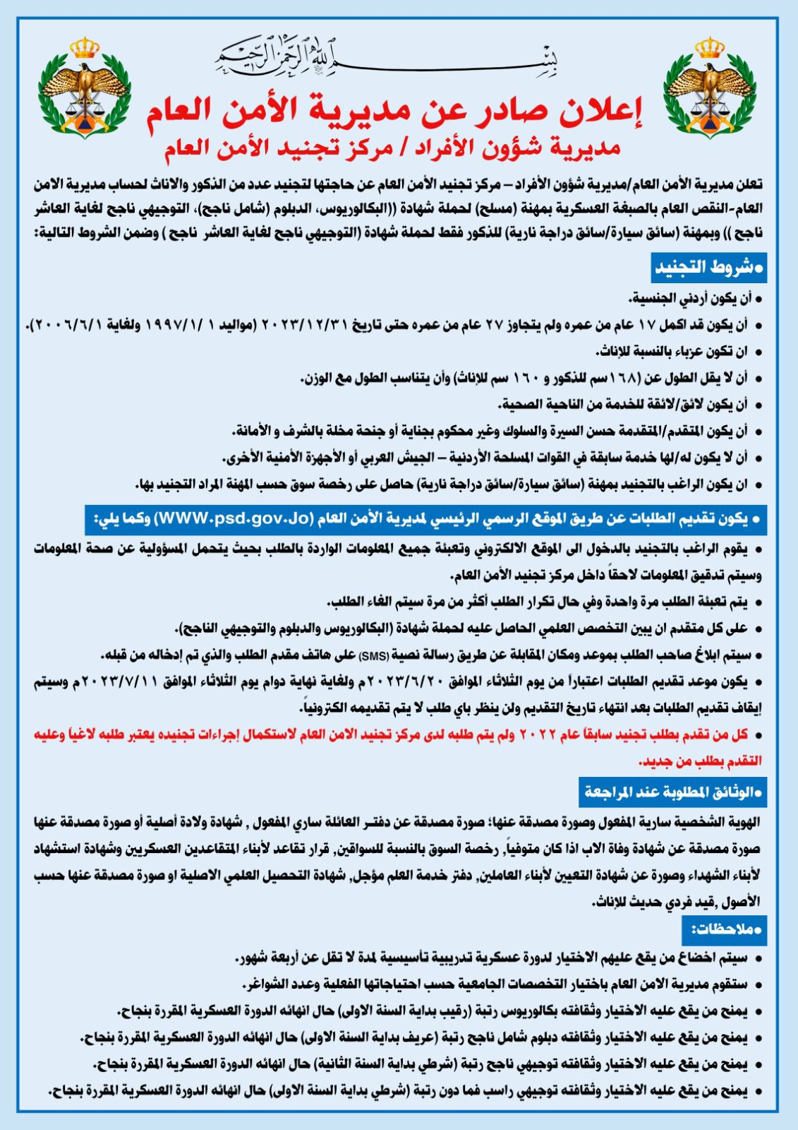 أعلنت مديرية الأمن العام/ مديرية شؤون الأفراد – مركز تجنيد الأمن العام، عن حاجتها لتجنيد عدد من الذكور والاناث لحساب مديرية الامن العام- النقص العام، بالصبغة العسكرية بمهنة (مسلح) لحملة شهادة: البكالوريوس، الدبلوم (شامل ناجح)، التوجيهي ناجح، ولغاية العاشر ناجح.