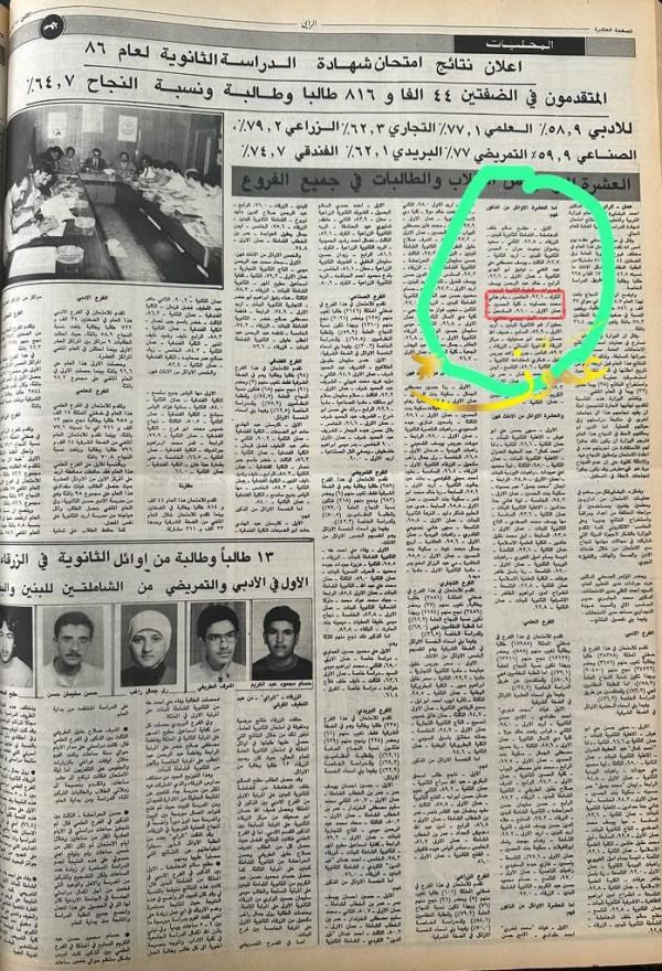 عاجل / ردا على التلفيقات والتشكيك ….. الرئيس بشر الخصاونة الخامس على التوجيهي عام ١٩٨٦ ( وثيقة )