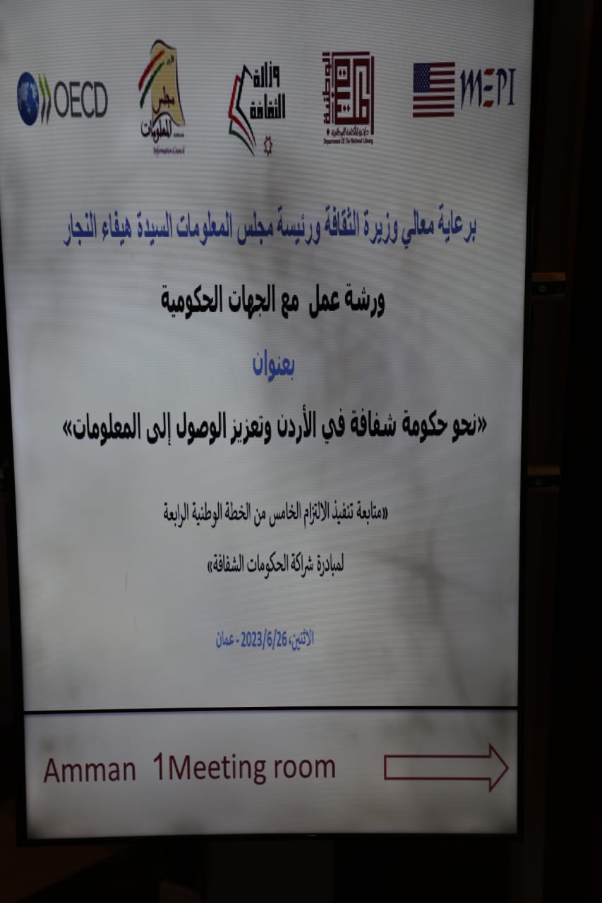 افتتحت وزيرة الثقافة ورئيسة مجلس المعلومات هيفاء النجار اليوم الاثنين (26 /6 ) ورشة عمل (نحو حكومة شفافة في الأردن وتعزيز الحصول على المعلومة)، لدعم ومتابعة تنفيذ الالتزام الخامس من الخطة الوطنية الرابعة لمبادرة شراكة الحكومات الشفافة المتعلق بـ "تعزيز مأسسة قانون حق الحصول على المعلومات" بفندق موفينبك عمان.